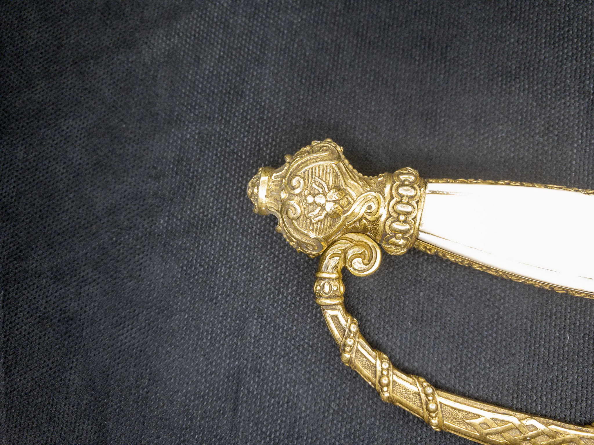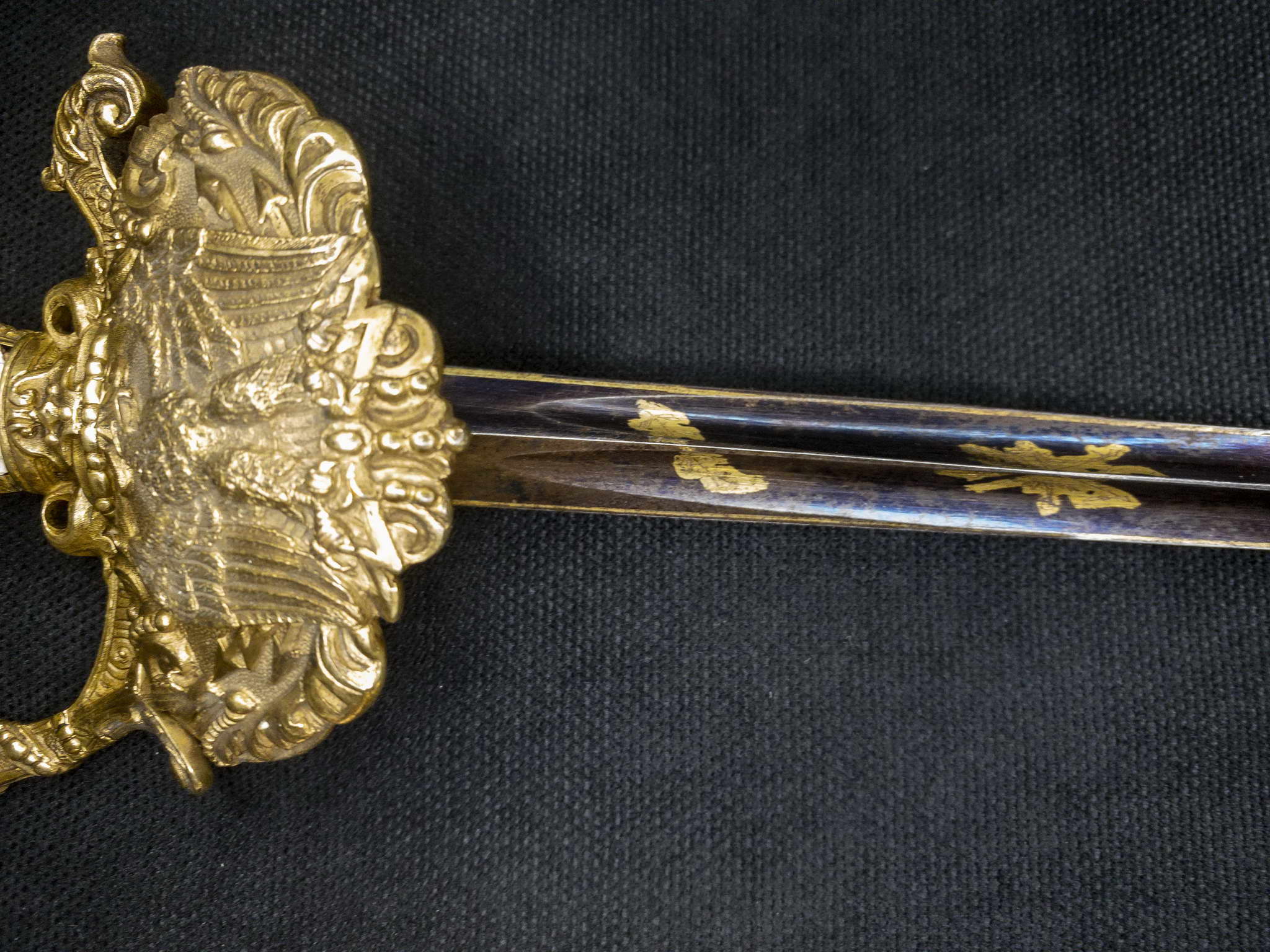 Эфес шпаги включает в себя рукоять и позолоченную латунную гарду. Навершие с изображением пчелы. Соединительная дужка обильно украшена канатом с бусинками и характерными завитками. Рукоять состоит из двух плашек с двумя боковыми шлицами с лицевой стороны перламутровая, на оборотной стороне плашка выполнена с рога буйвола черного цвета. Чашка гарды симметричная с довольно замысловатым бордюром, с изображением большого орла на молниях и на зернистом фоне.