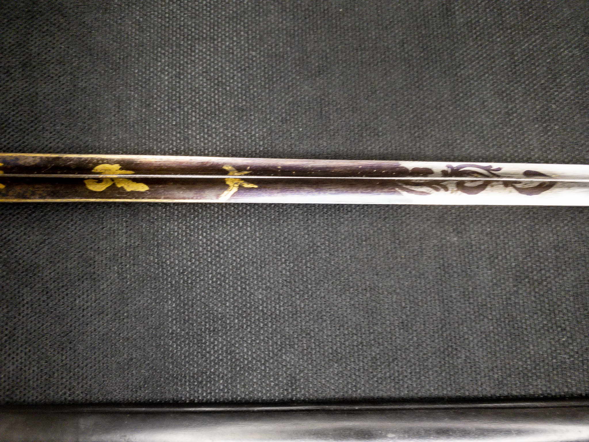 Клинок шпаги стальной, прямой, трехгранный, сужающийся к острию. Боевой конец игольчатого типа. В верхней части полотно клинка с обеих сторон на 1/3 от основания украшено позолоченными изображениями веночков, веточек и военной арматуры с дополнительной проработкой гравировкой на вороненом фоне. Заканчивается украшение клинка вороненой виньеткой.