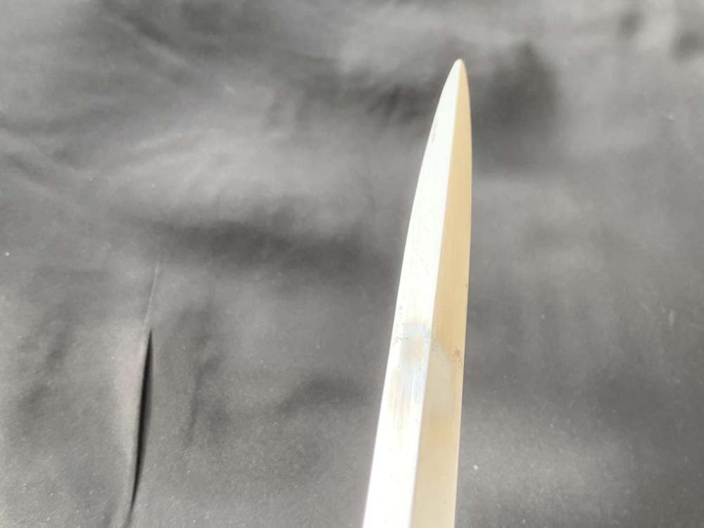 Клинок ромбического сечения, полированный, нечем не украшен. Вплотную к рукояти на клинок надет плотный кожаный ограничитель. Возле эфеса на клинке расположено частично сохранившиеся клеймо производителя — Manufre Royale du Klingenthal и на обратной стороне год выпуска также частично сохранился — 1825.