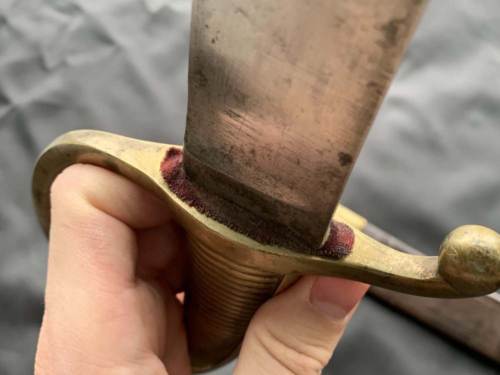 Литой латунный эфес тесака состоит из рукояти и гарды, представляющих единое целое. Рукоять прямая, округлая, со скошенной верхней частью, покрыта частыми поперечными бороздками; планка рукояти плавно переходит в округлую дужку и далее крестовину с отогнутым книзу каплевидным концом. Миндалевидная головка фиксирует врасклёп хвостовик клинка. Со стороны клинка к средокрестию имеет овальный тканевый ограничитель красного цвета. Элемент служит ограничителем между эфесом и ножнами тесака. При вкладывании клинка в ножны мягкая по своим свойствам деталь гасит ударное воздействие обеих металлических частей, тем самым предотвращая износ материала и не нужный звон.