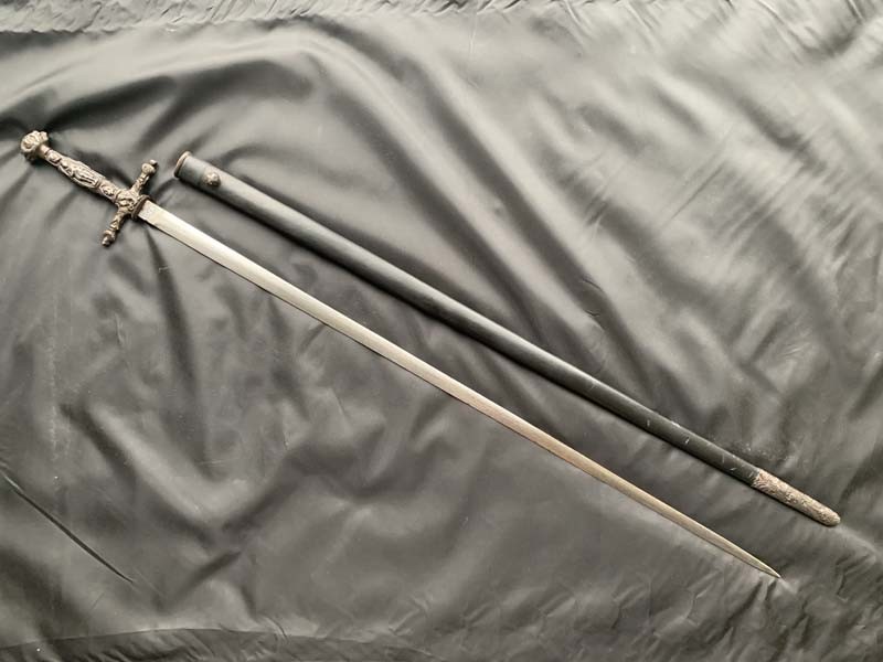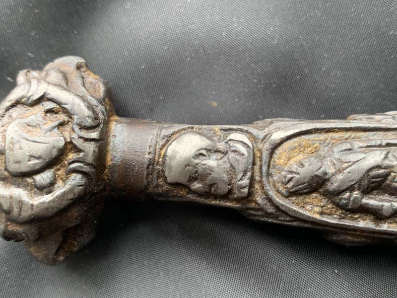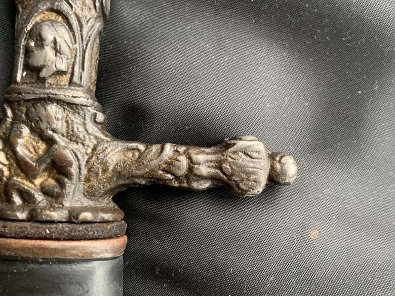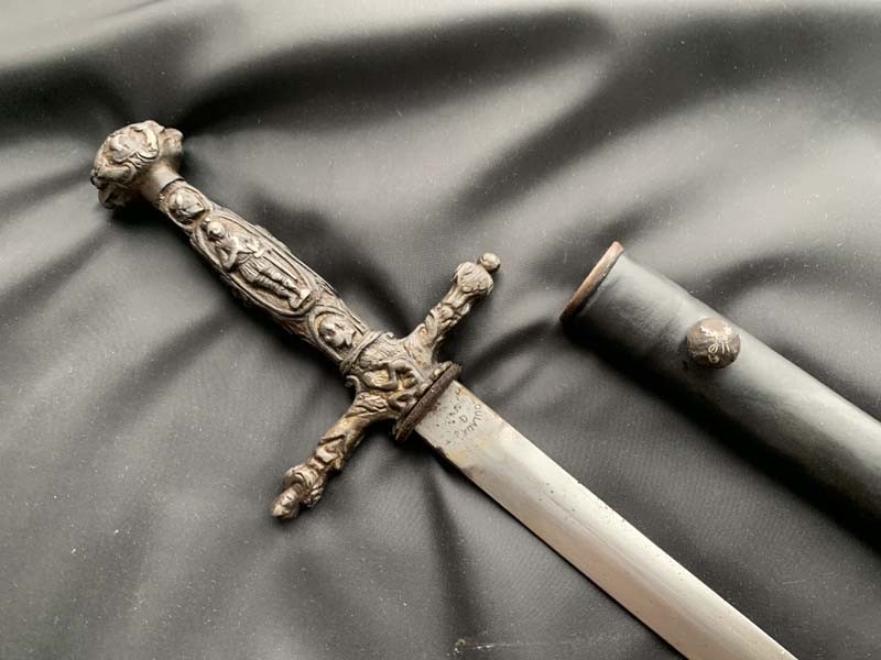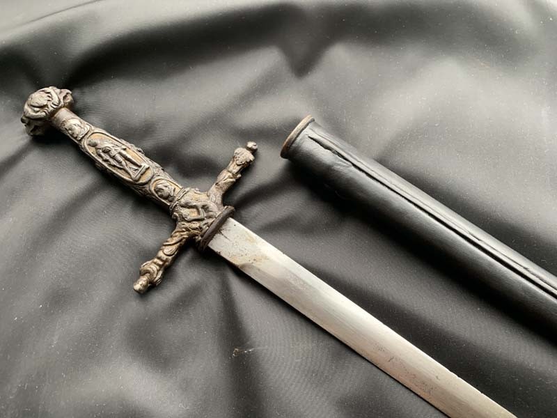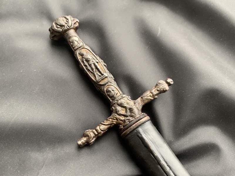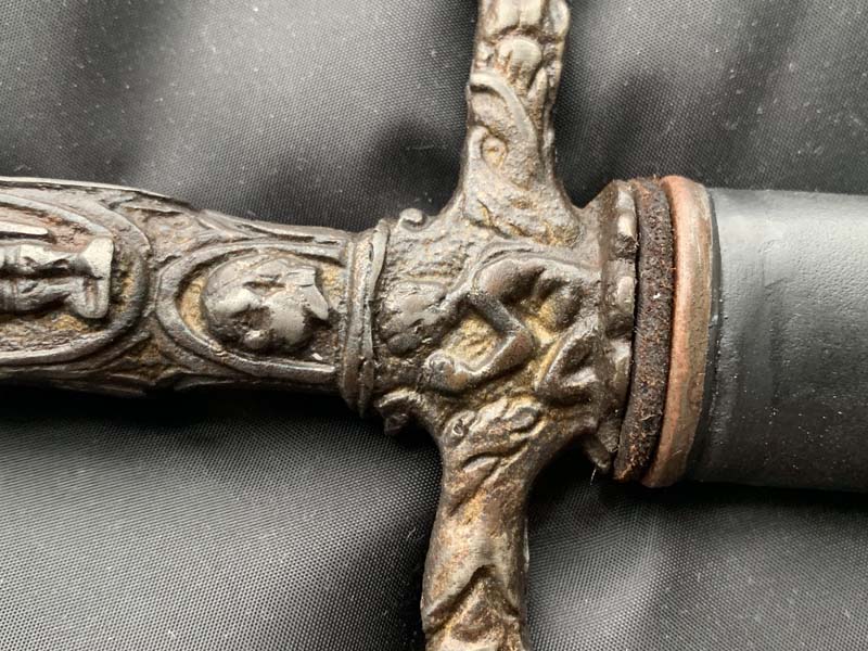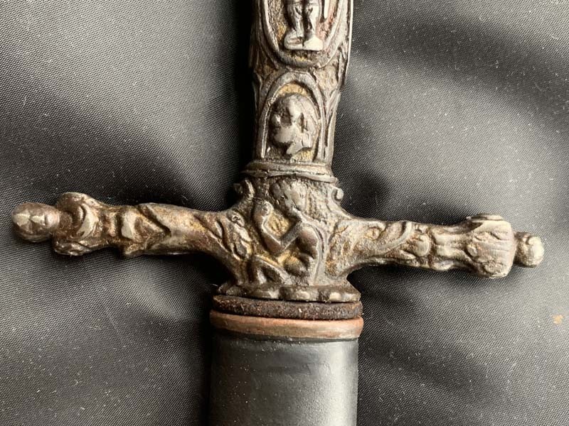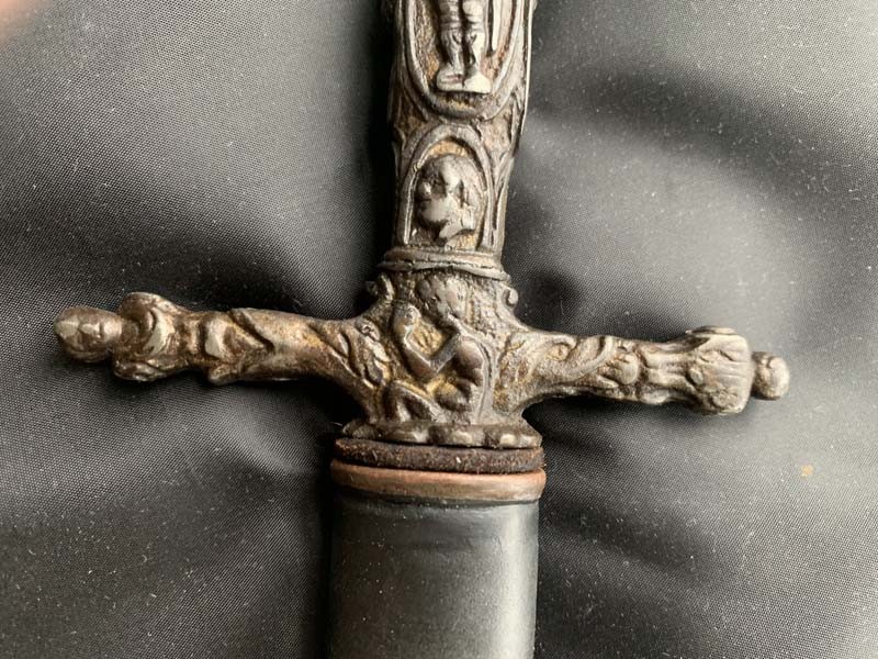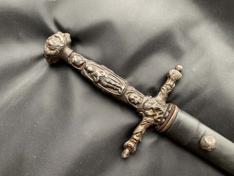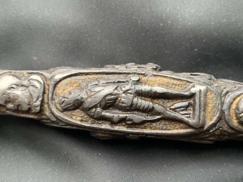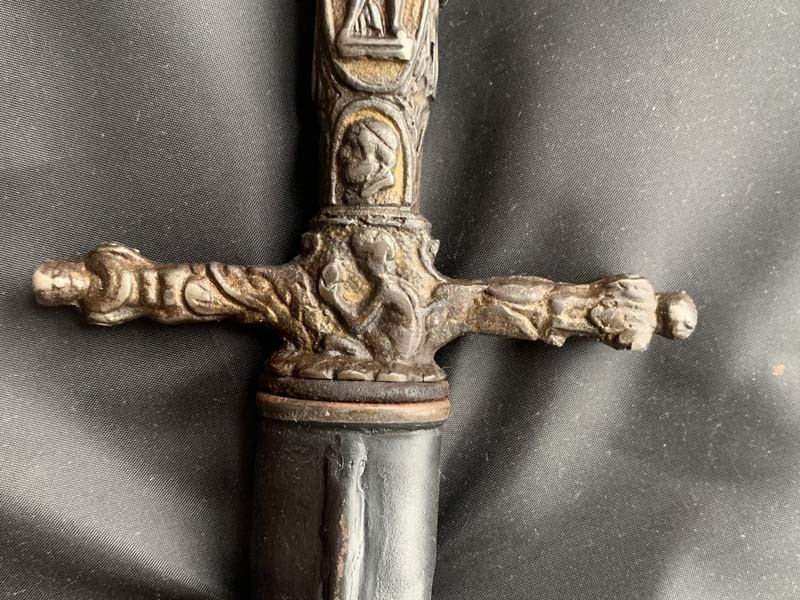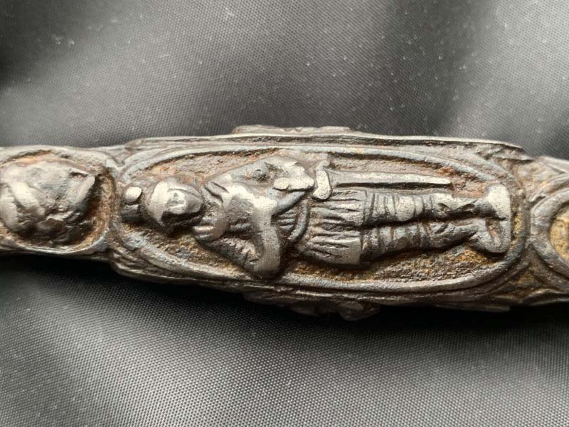 Это декоративная настенная шпага — меч, Франция, 1860-70гг в средневековом стиле. Эфес литой,металлический, состоит из рукояти с головкой и крестовины. Все детали эфеса представляют собой многофигурные композиции. Концы крестовины выполнены в виде рыцарей. Клинок прямой, двулезвийный. На клинке клеймо производителя — французской мануфактуры «Frenc h Coulaux & Cie,Klingenthal». Ножны металлические, кожа на них была перетянута.