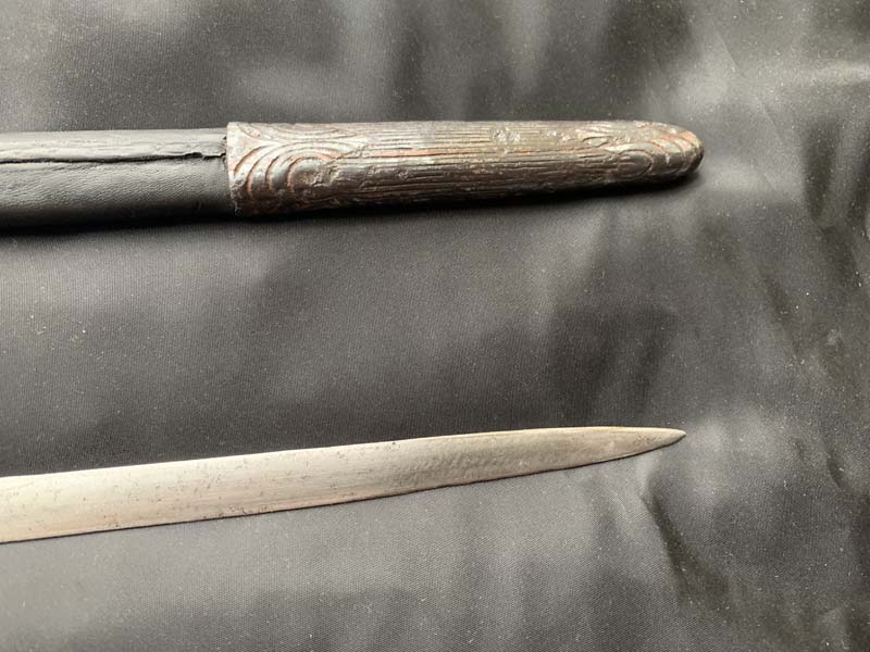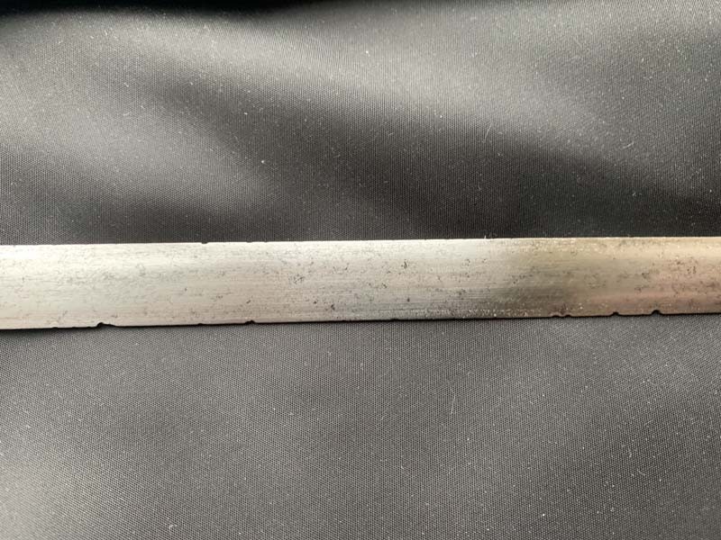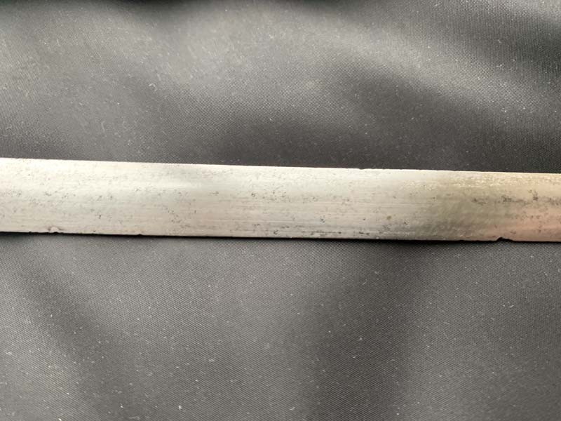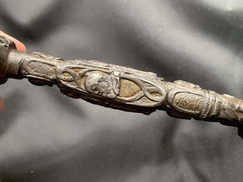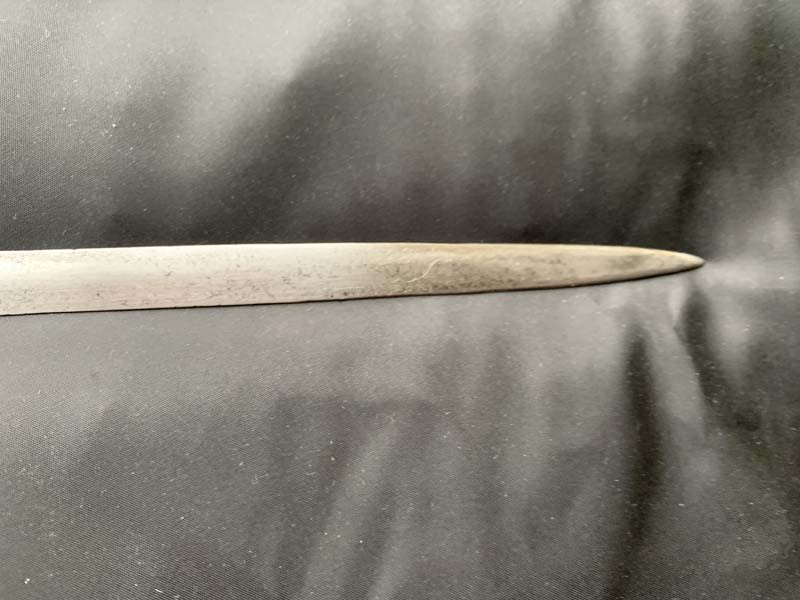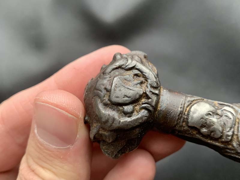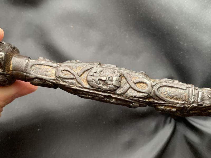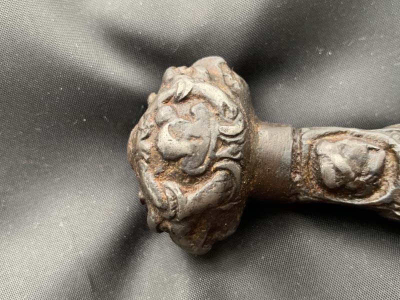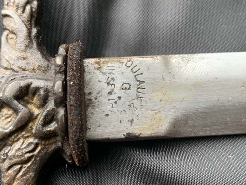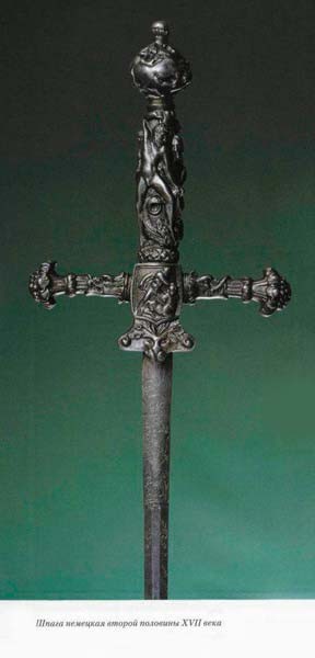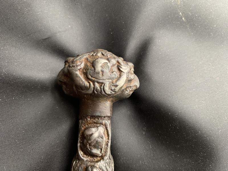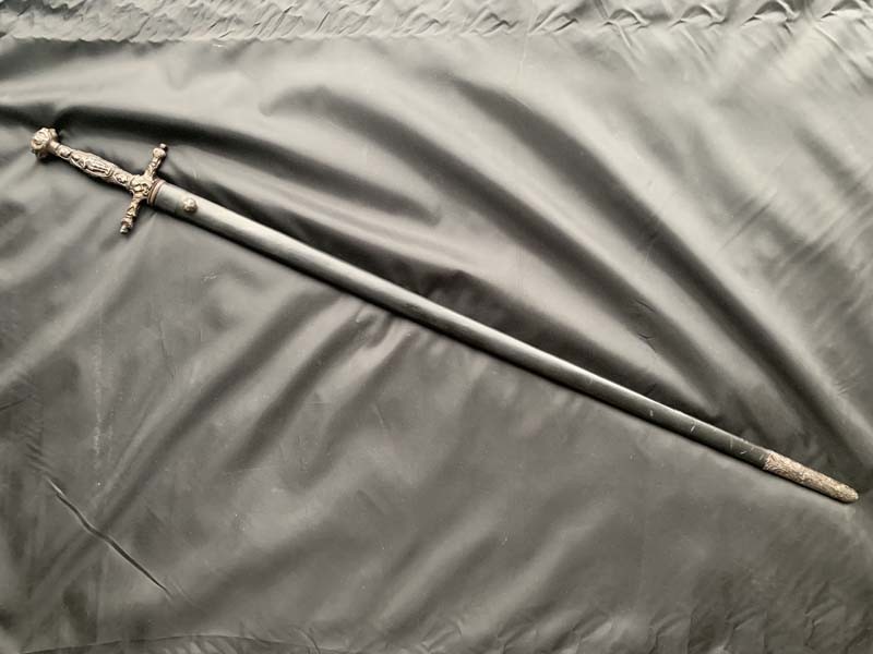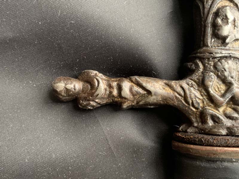 Это декоративная настенная шпага — меч, Франция, 1860-70гг в средневековом стиле. Эфес литой,металлический, состоит из рукояти с головкой и крестовины. Все детали эфеса представляют собой многофигурные композиции. Концы крестовины выполнены в виде рыцарей. Клинок прямой, двулезвийный. На клинке клеймо производителя — французской мануфактуры «Frenc h Coulaux & Cie,Klingenthal». Ножны металлические, кожа на них была перетянута.
