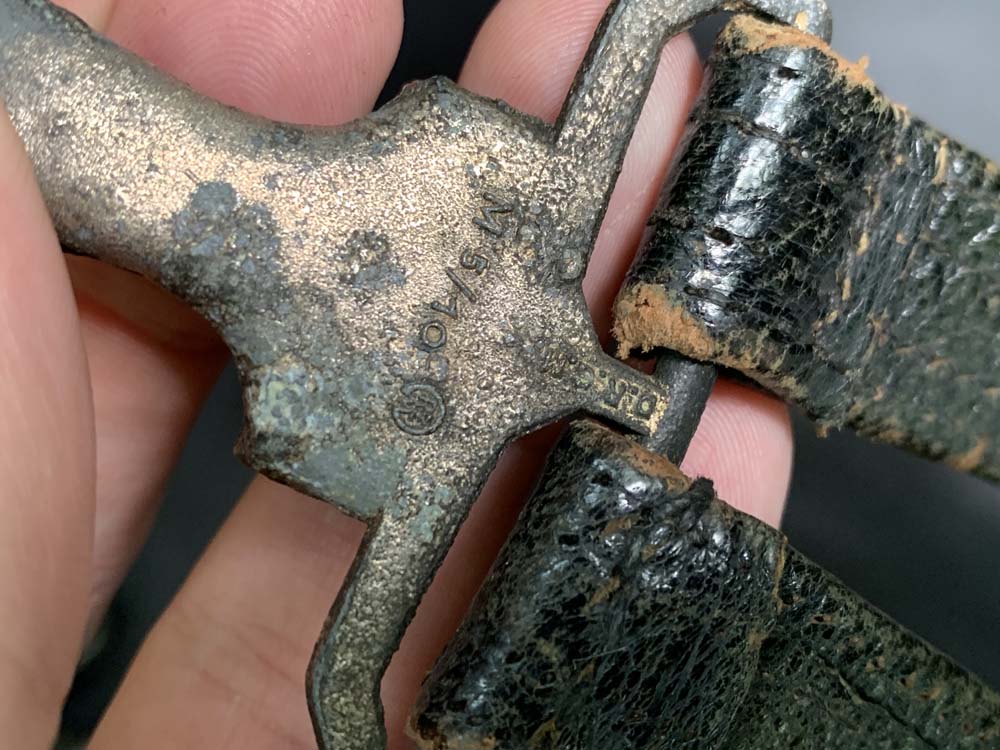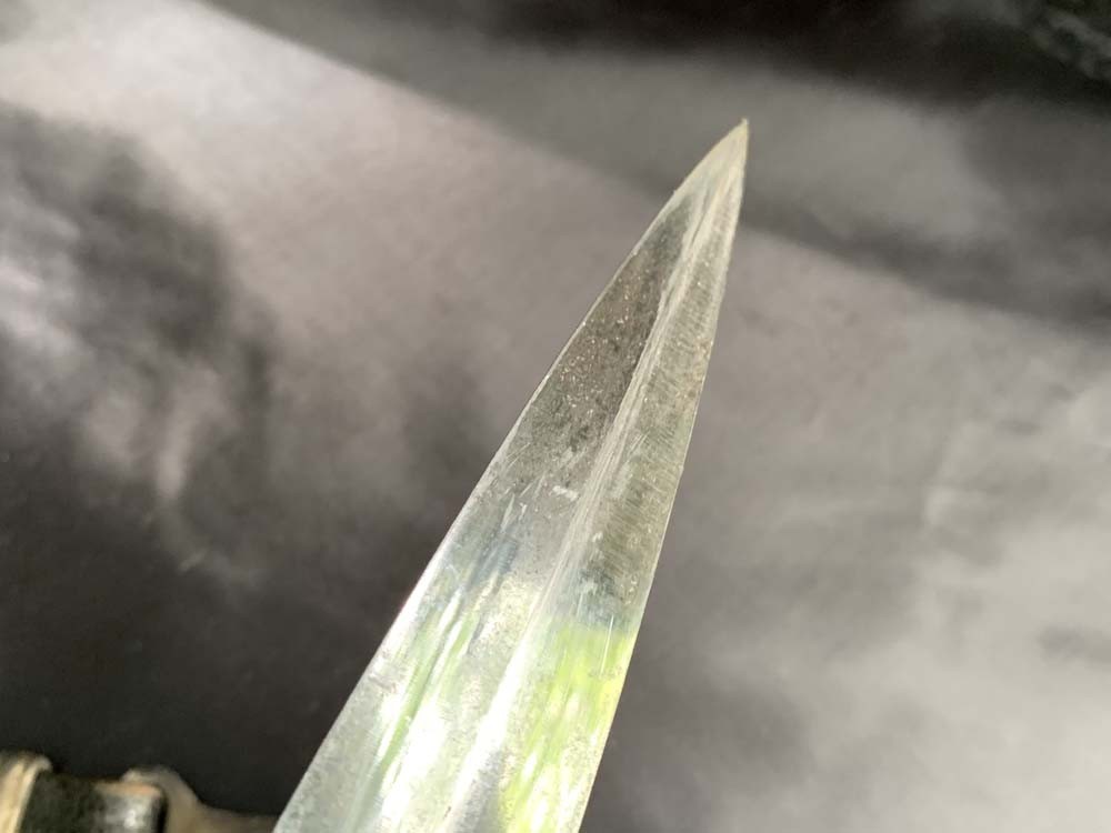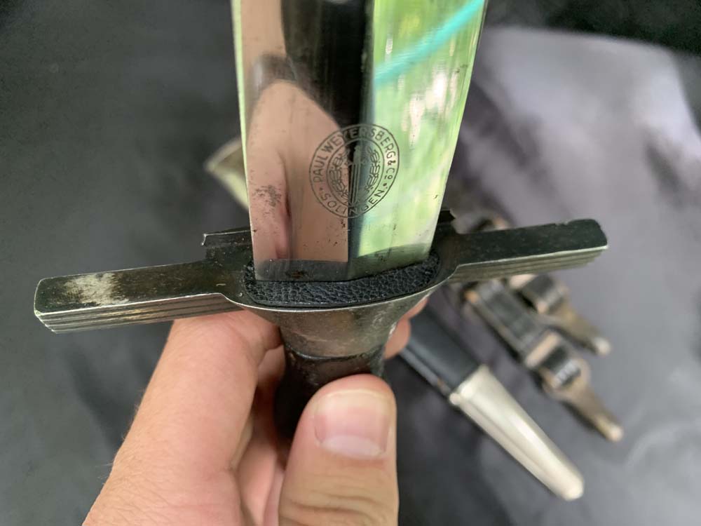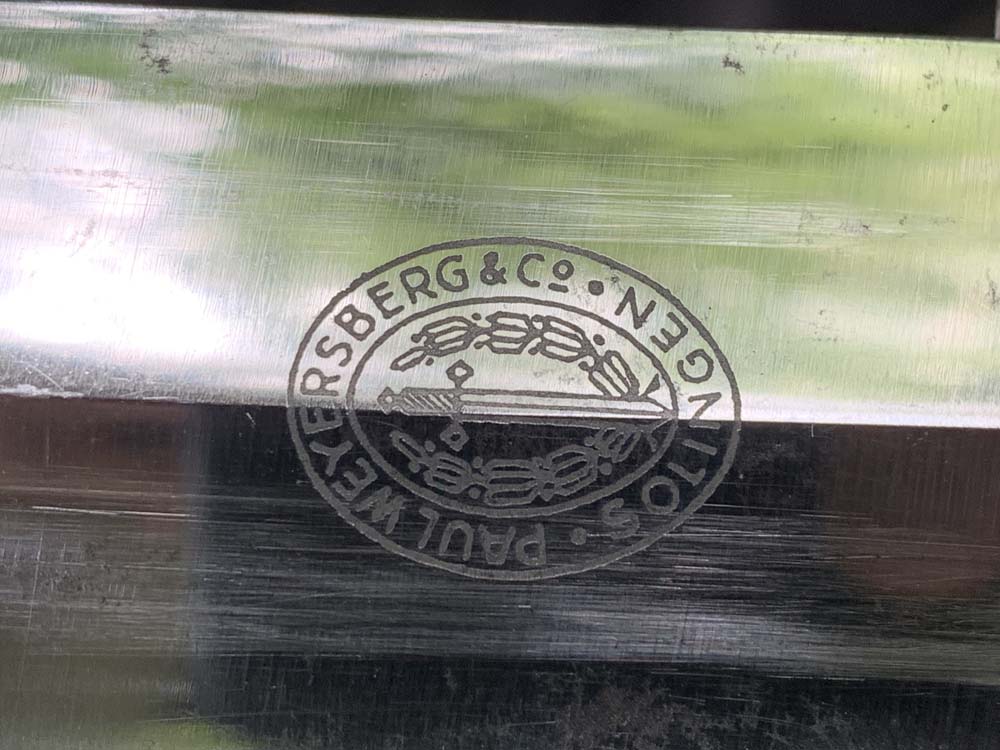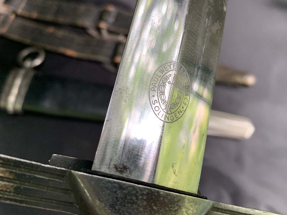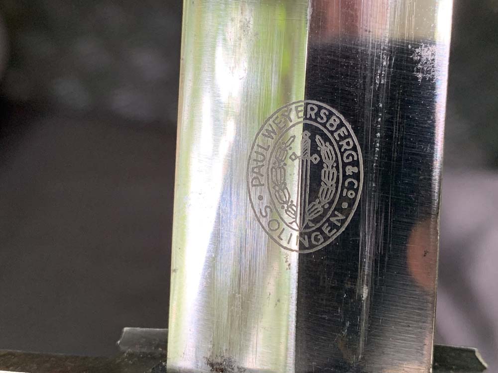 Клинок плоский прямой ромбического сечения. Возле пяты клинка с тыльной стороны – травлёное клеймо в виде меча в овале и надпись «Paul Weyersberg, Solingen» — клеймо немецкой фирмы производителя Пауль Вайерсберг Золинген.