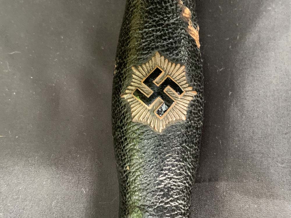 Крестовина прямой формы коническая в сечении с тремя продольными бороздками. На лицевой части крестовины закреплено стилизованной изображение орла, держащего в лапах круг со свастикой. Все детали рукояти металлические.