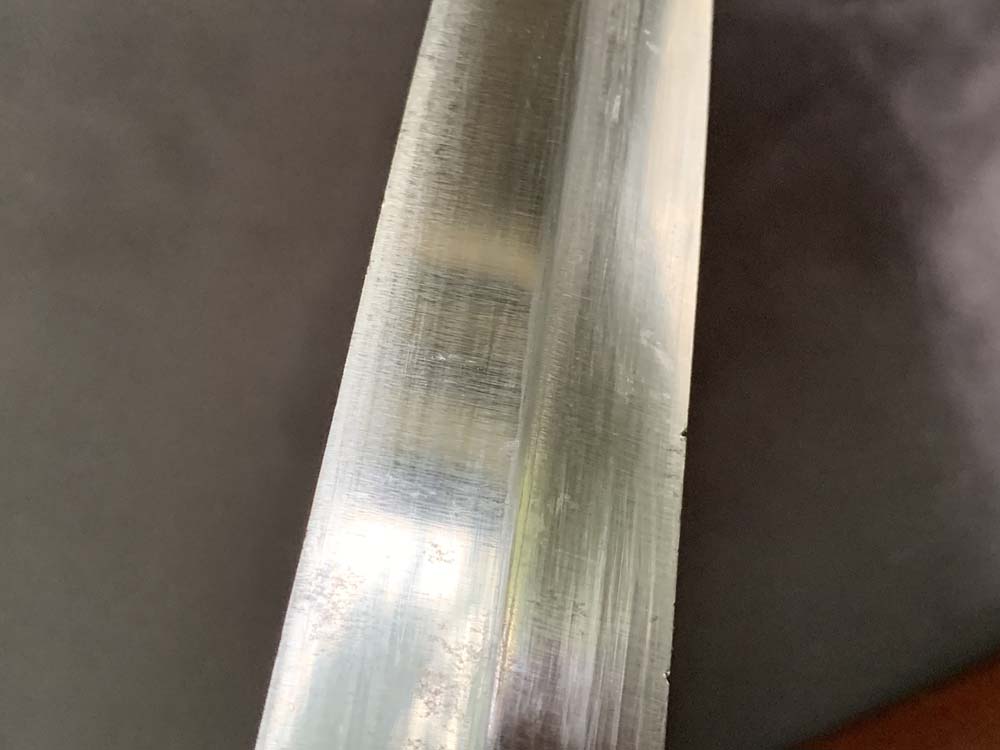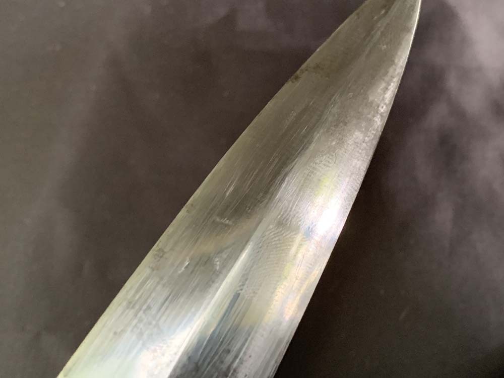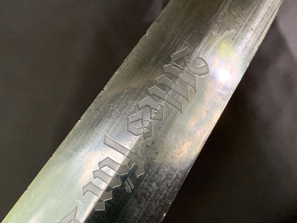 Клинок прямой, обоюдоострый, плоский, ромбический, плавно сужающийся к острию, полированный. На лицевой стороне надпись готическим шрифтом «Alles fur Deutschland» — «Все для Германии», на обратной стороне под крестовиной — клеймо производителя RZM M7/36 — Hörster E. & F. Co., Solingen.