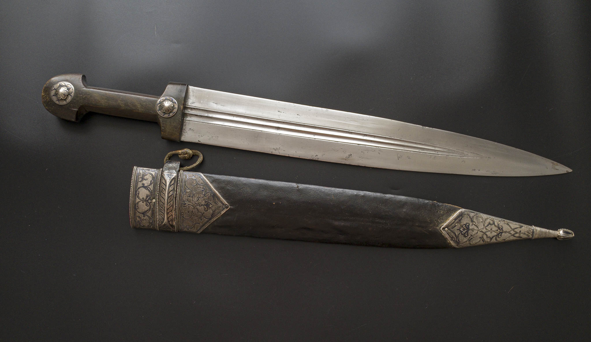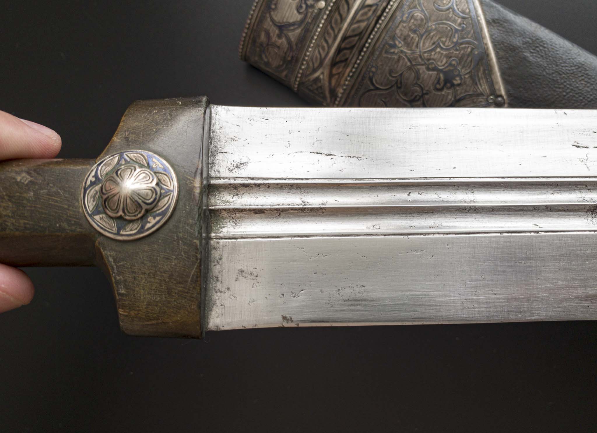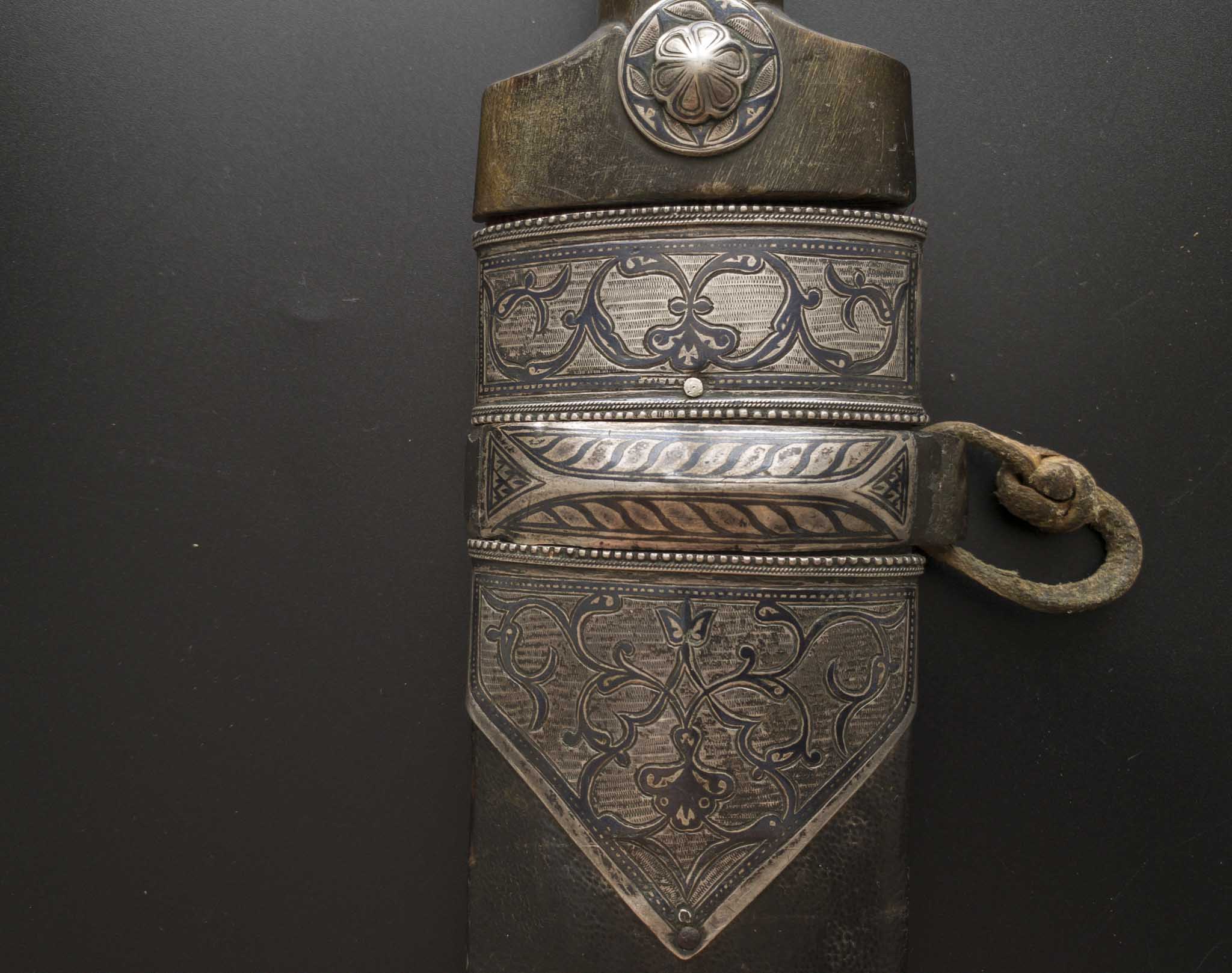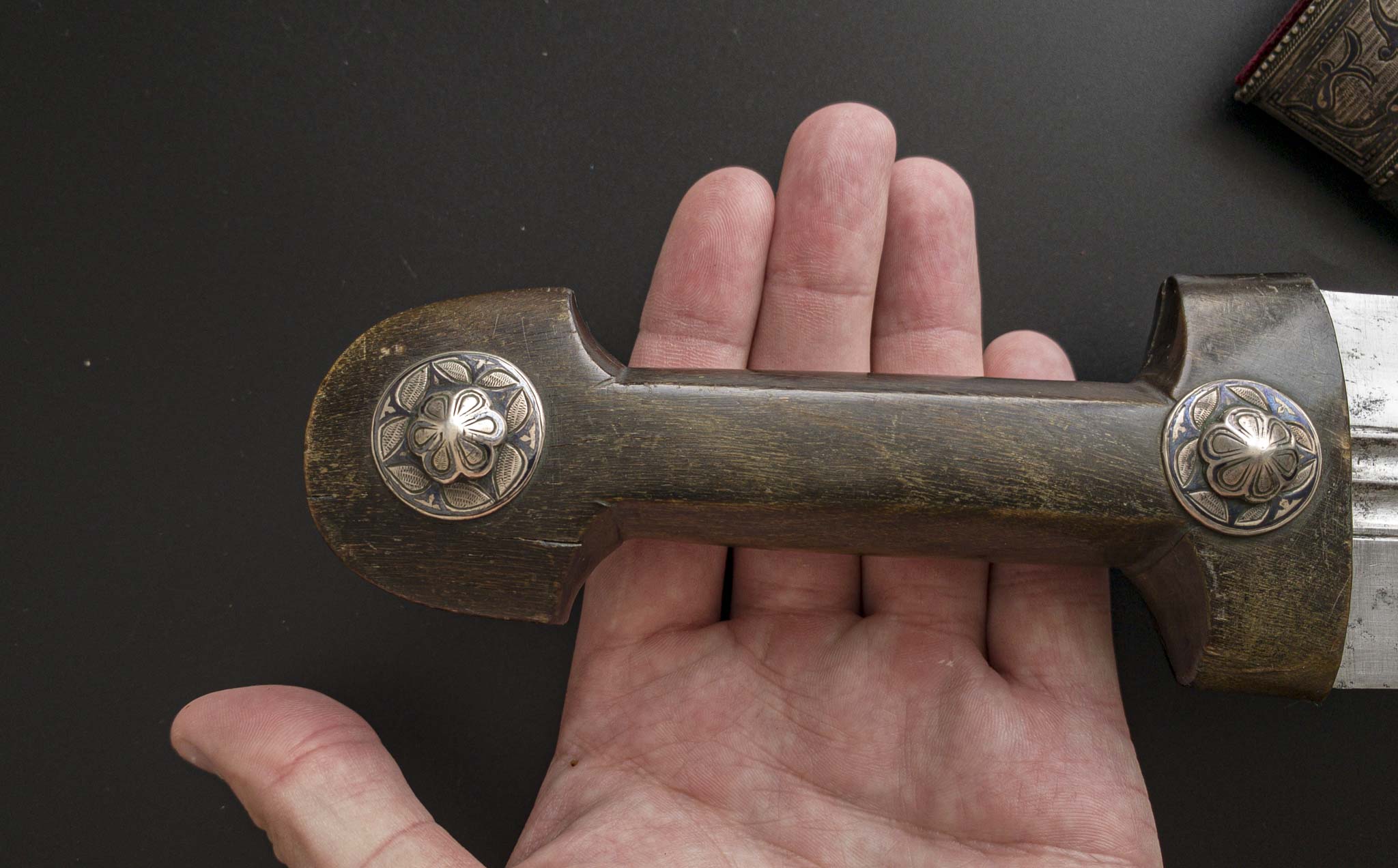 Рукоять кинжала выполнена из массивного рога буйвола, заклепана двумя заклепками украшенными в виде серебреных шляпок с геометрическим орнаментом в черни.