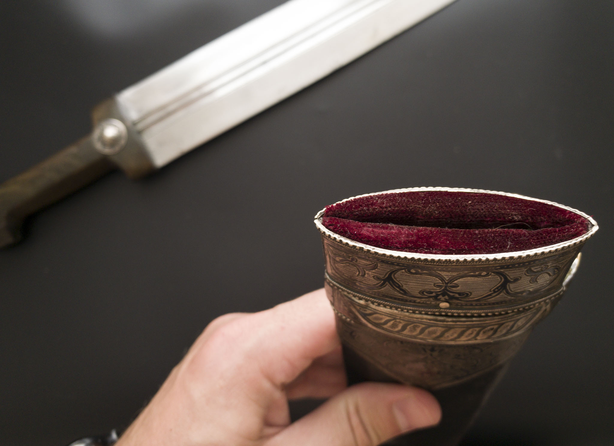 Ножны деревянные обтянуты кожей, состоят из серебреного устья с обоймицой для крепления ремня и серебренного стакана с шариком. На устье внутри обоймицы имеется кольцо с кожаным ремешком. На оборотной стороне ножен размещены клейма по серебру с «84» пробой и инициалами, на устье, обоймице и стакане Блюмберг («Е.Б.» пробирный мастер Егор Иванович Блюмберг, 1841-1886 гг.). Прибор кинжала украшен растительным орнаментом в технике чернения, очень красивая ручная работа выделяет данный кинжал.