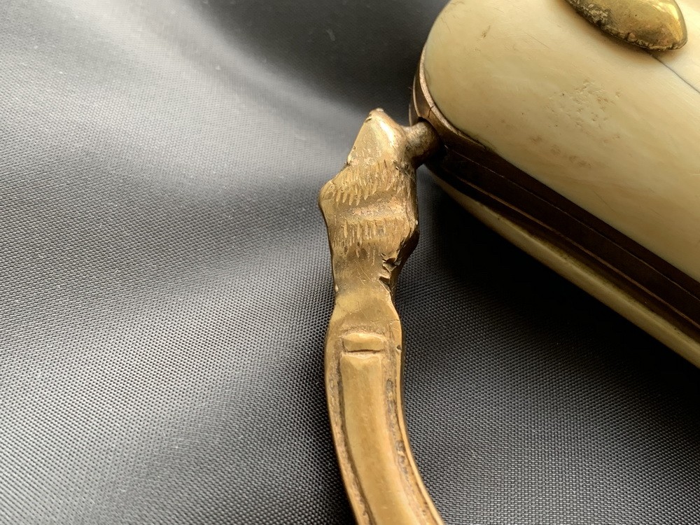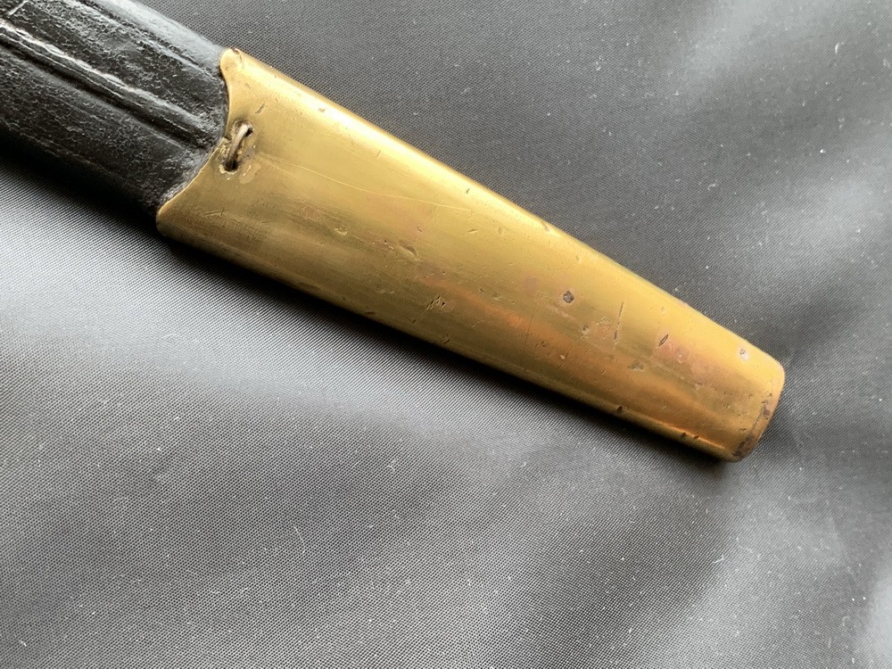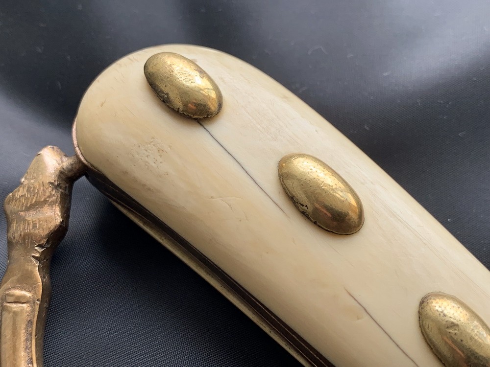 Рукоять: металлическая с двумя костяными накладками (вероятно слоновая кость), данные накладки крепятся к металлической части рукояти с помощью трех латунных заклепок в виде желудей. . Крестовина с одной стороны переходит в защитную дужку другой (в виде копиться). Под крестовиной расположен латунный щиток