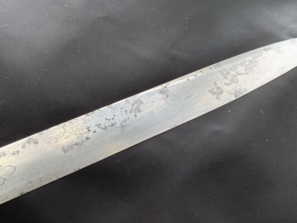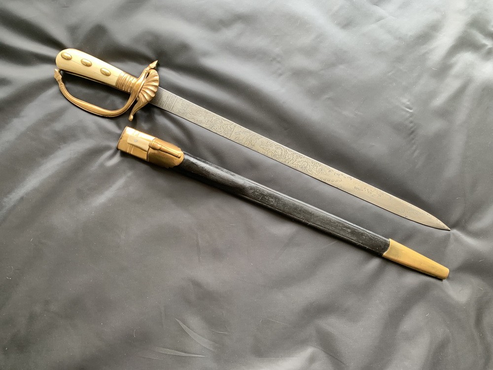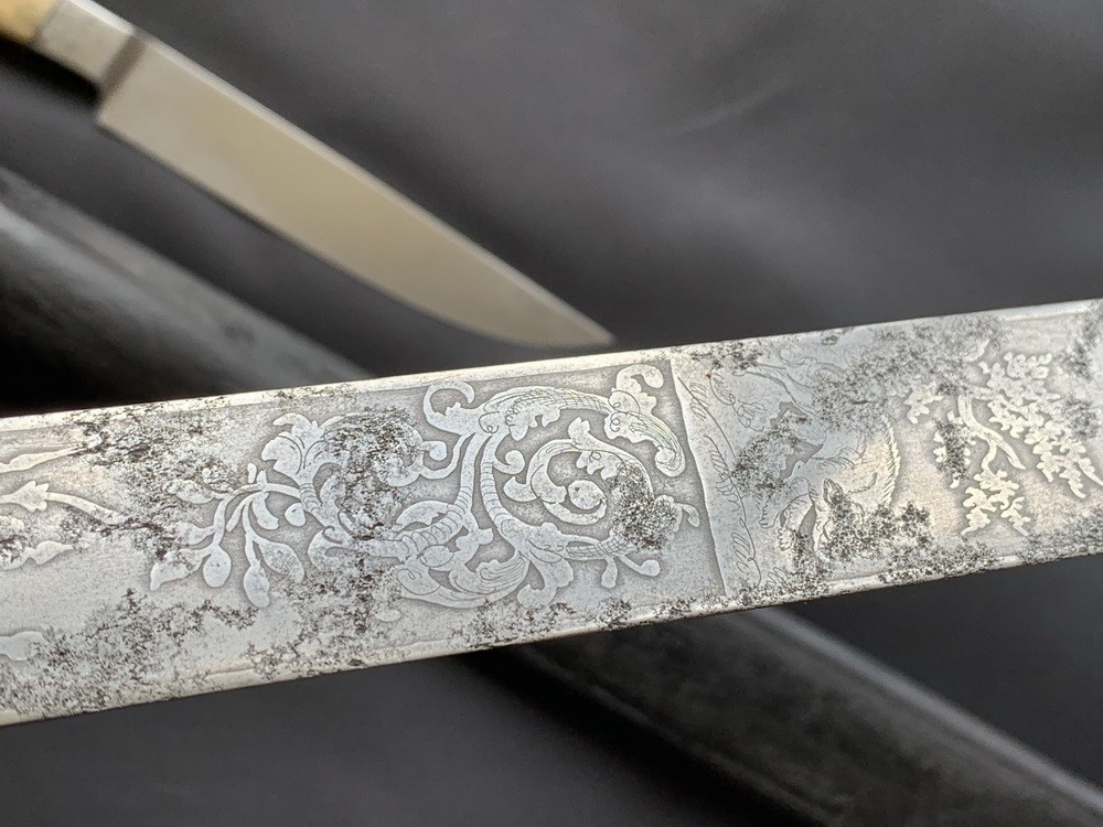 Клинок: стальной, прямой, плоский на клинке присутствует глубокое травление в виде растительного орнамента также небольшая сцена с оружием и охотником, клинок был подвержен коррозией, но восстановлен и отполирован.