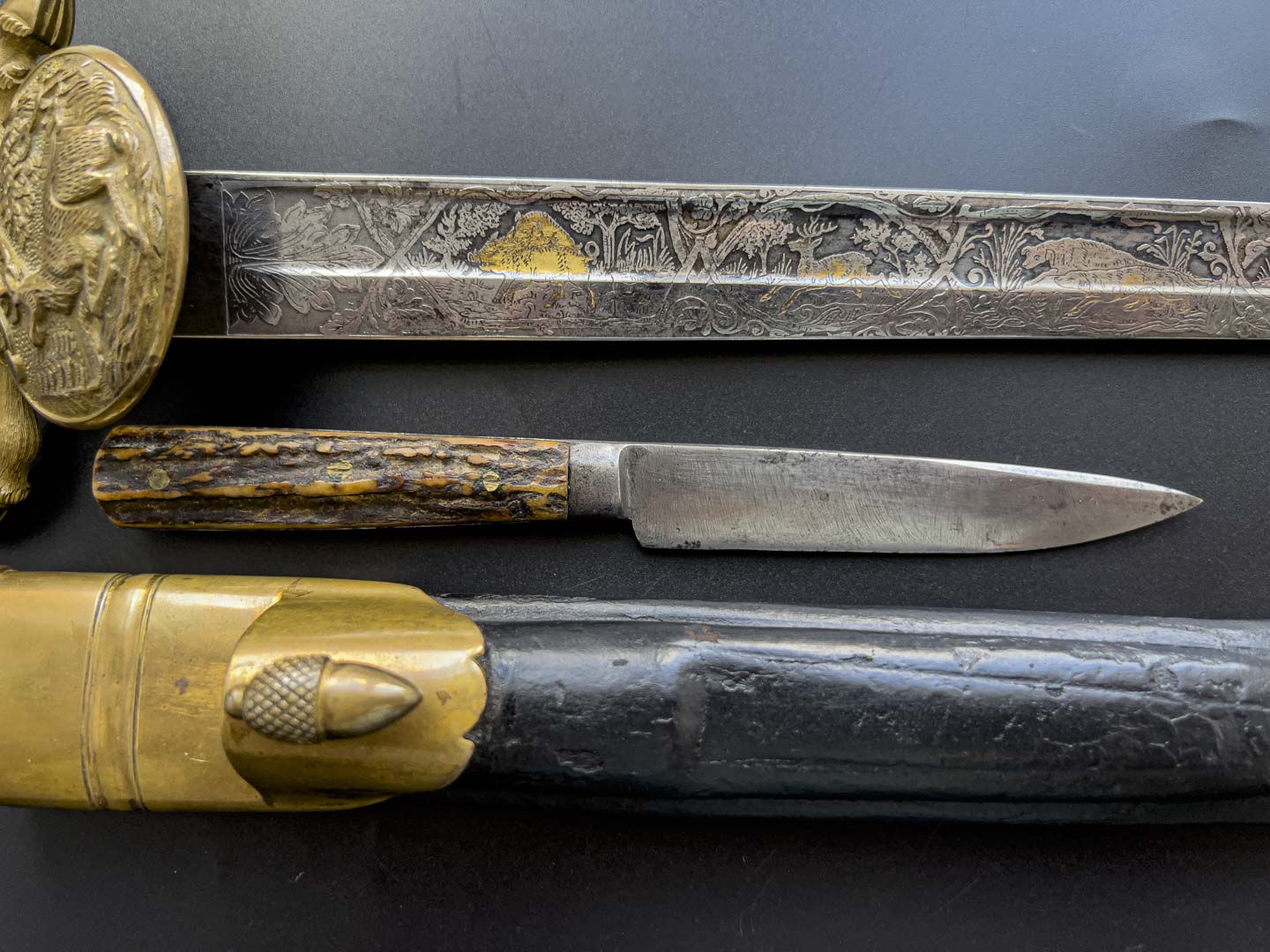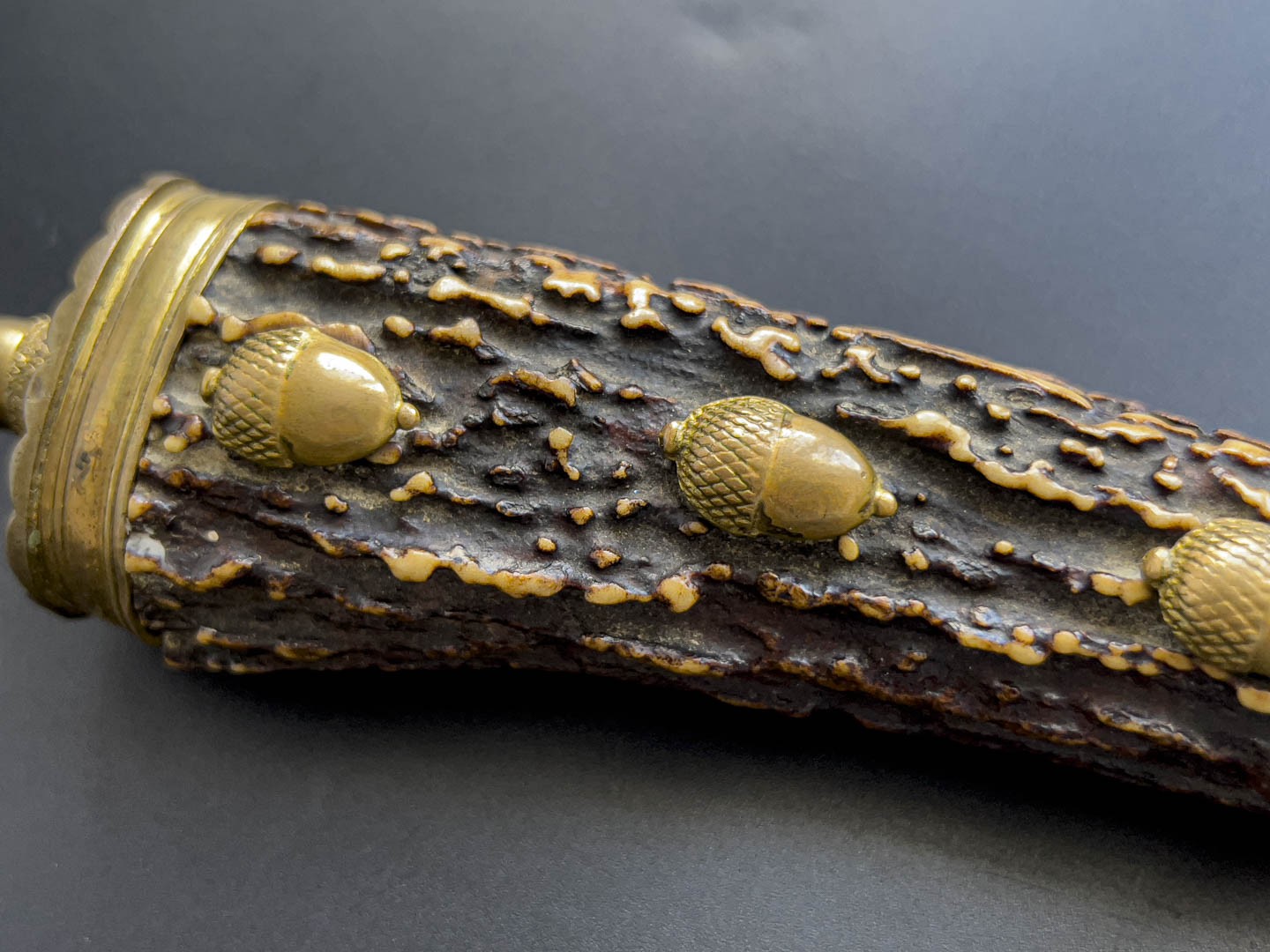 Рукоять роговая, крепится на черенке клинка всадным способом. На рукояти расположены три выпуклые накладки в виде желудей. Навершие рукояти стальное, овальной формы, плоское, с декоративным винтом в виде желудя. Крестовина рукояти в виде стилизованных копыт, направленных в разные стороны. А в центре крестовины изящно расположена голова кабана с обеих сторон. В центре перекрестья с лицевой стороны закреплен декоративный щитик. На щитике изображен олень.