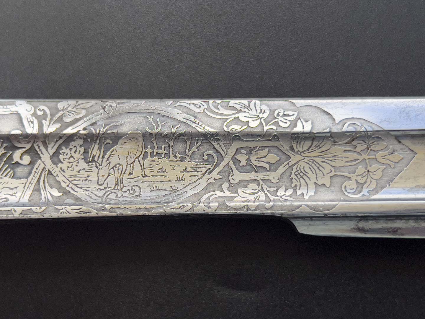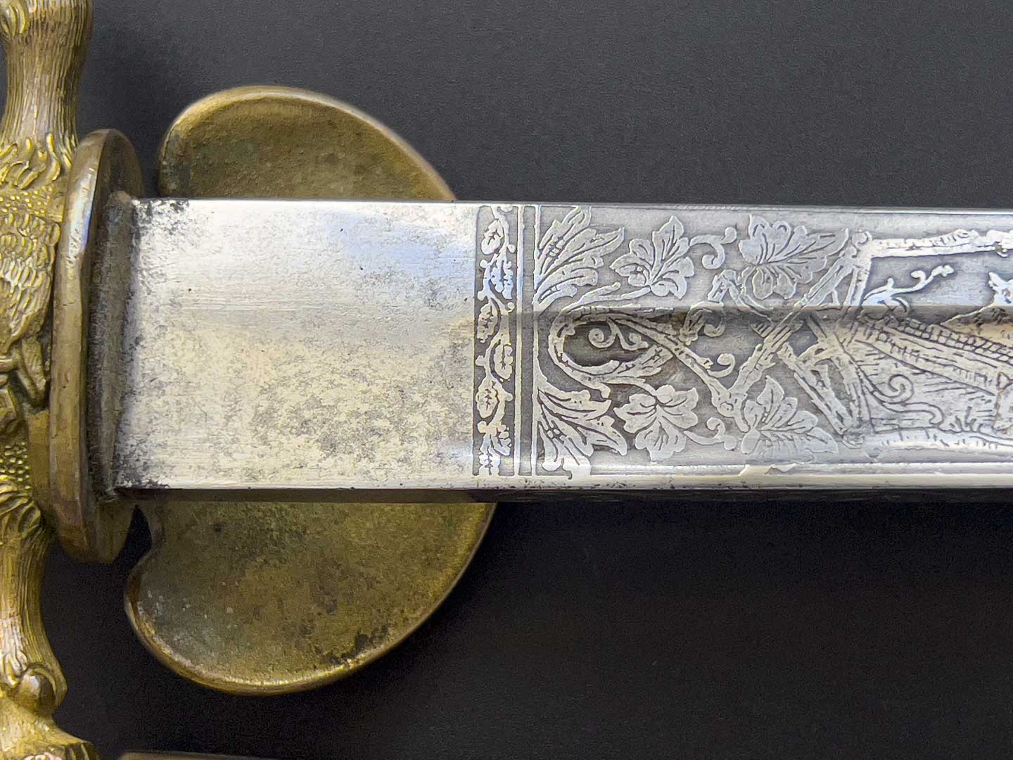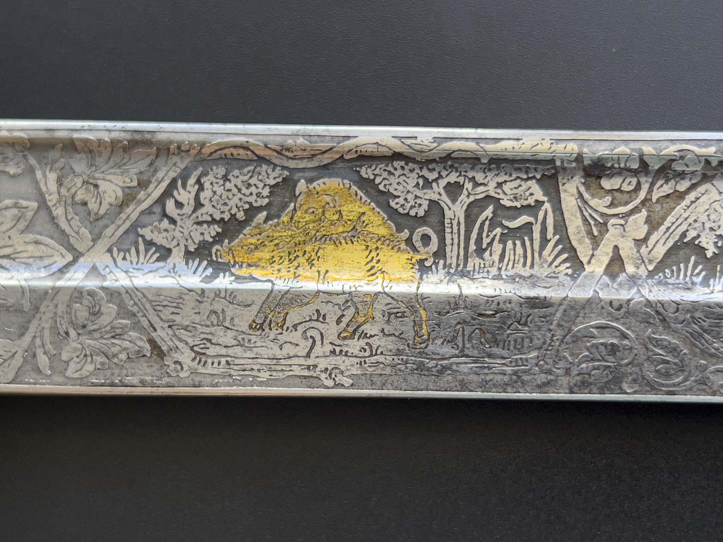 Клинок стальной, широкий, прямой, украшен с двух сторон травлеными орнаментами с элементами золочения на тему охоты. На клинке один широкий дол и елмань на половину клинка.