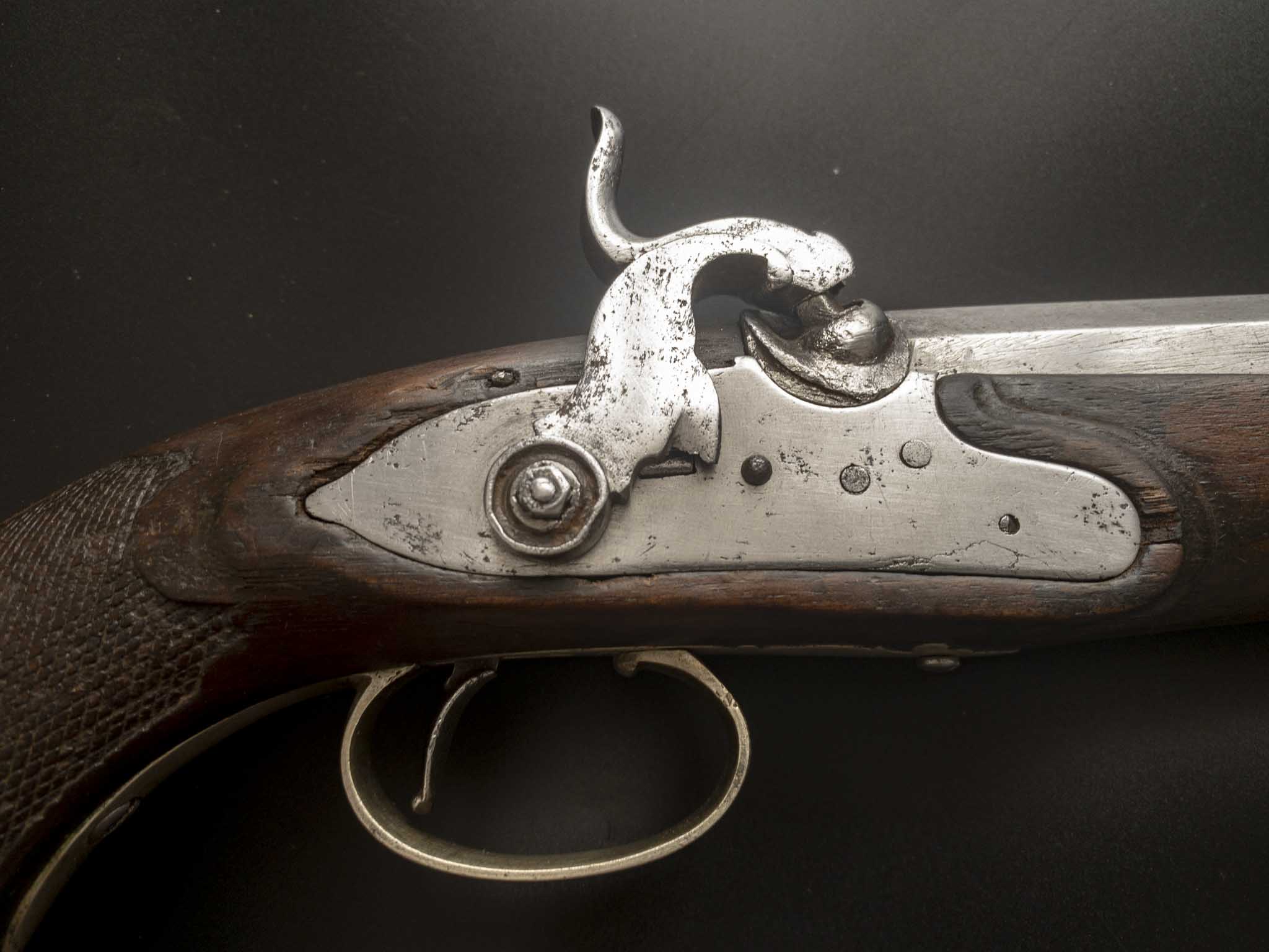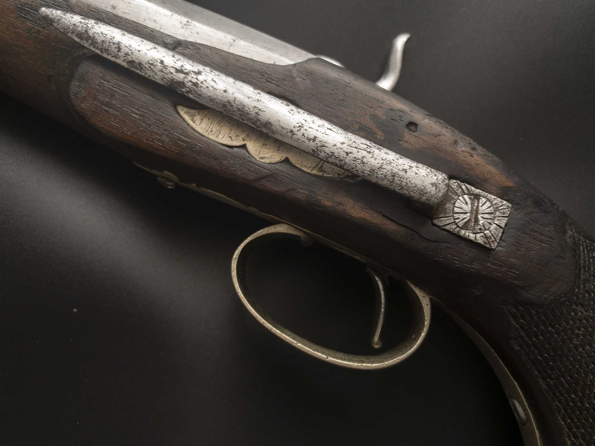 Перед вами оригинальный антикварный пистолет с капсюльным замком Испанского происхождения, об испанском происхождении говорят две металлические качели под курком, указывающие на тип замка «Miquelet lock», что был популярен в Испании.