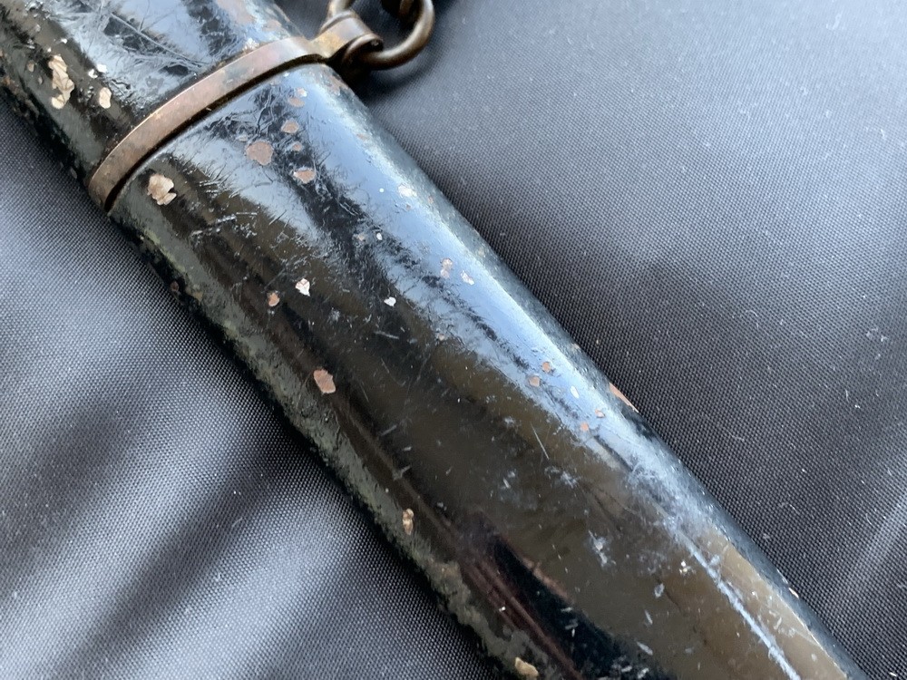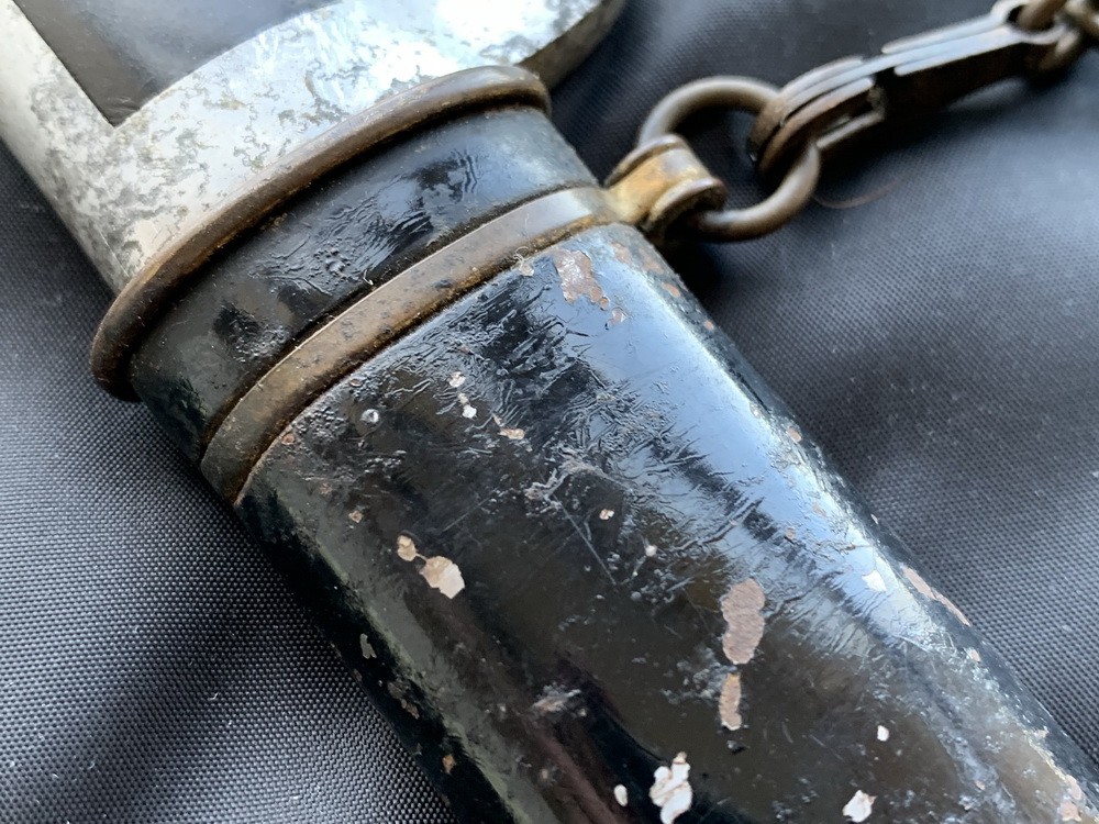 Ножны стальные, крашенные черной эмалью (На фото вы можете увидеть выступающую коррозию на ножнах). Прибор ножен латунный, состоит из тонкого устья, двух тонких гаек с подвижными кольцами для портупеи и наконечника с шариком.