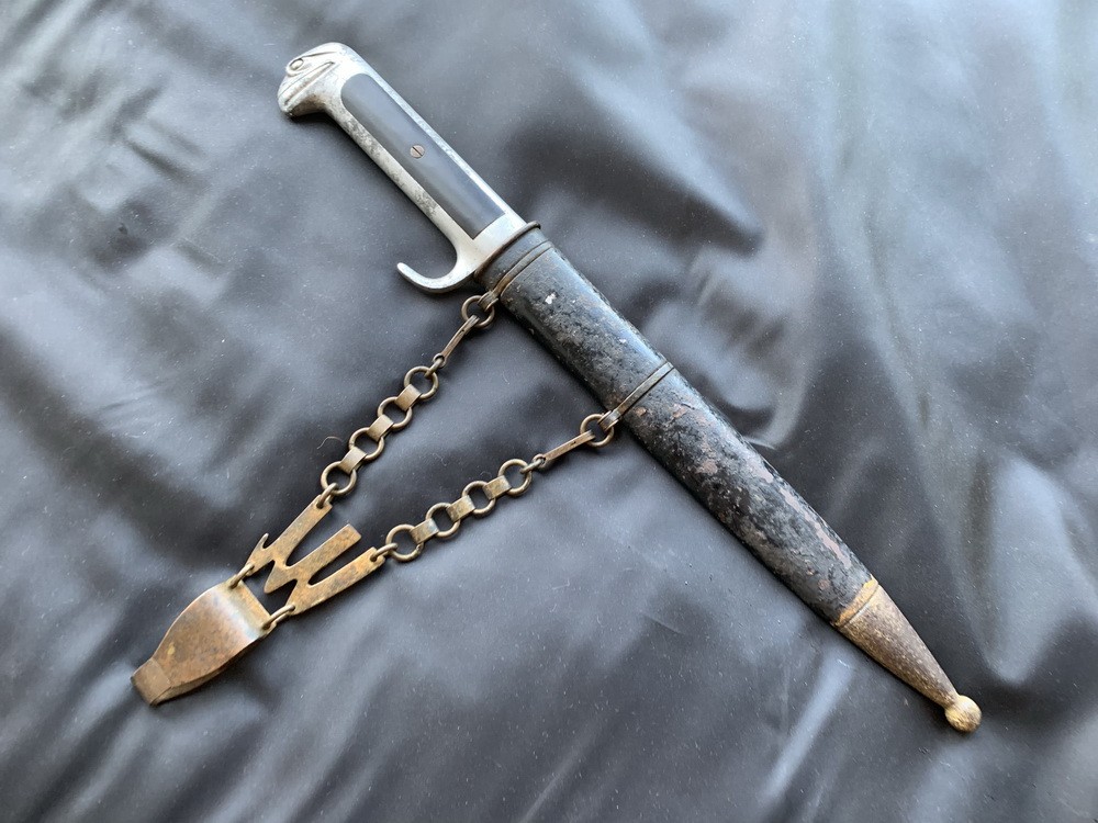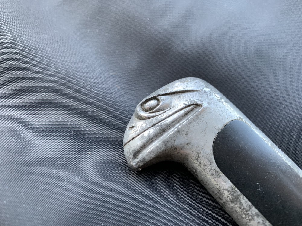 ОПИСАНИЕ: Классический кортик M.V.S.N. образца 1937 года с подвес с двойной цепью и золотыми и черными воротниками, как у модели 1932 года. Рукоятка модели 1937 года необычна тем, что она обращена к задней кромке, а не к более обычной передней кромке. На лицевой стороне ремня есть большой римский орел, обведенный черной краской над буквами «SPQR», «Senatus Populus Que Romanus» (для Сената и народа Рима). «MVSN», «Milizia Volontaria per la Sicurezza Nazionale» («Волонтерская милиция за национальную безопасность»), чаще называют «Черные рубашки». Этот кинжал в отличном состоянии. Это носили конечно, но никогда не злоупотребляли. Клинок мятный! Позолоченный наконечник ножен немного запятнан; однако это не умаляет общей красоты этого редкого и исторически важного фашистского оружия. Длина в ножнах составляет 14 дюймов. Очень немногие из них когда-либо появляются.