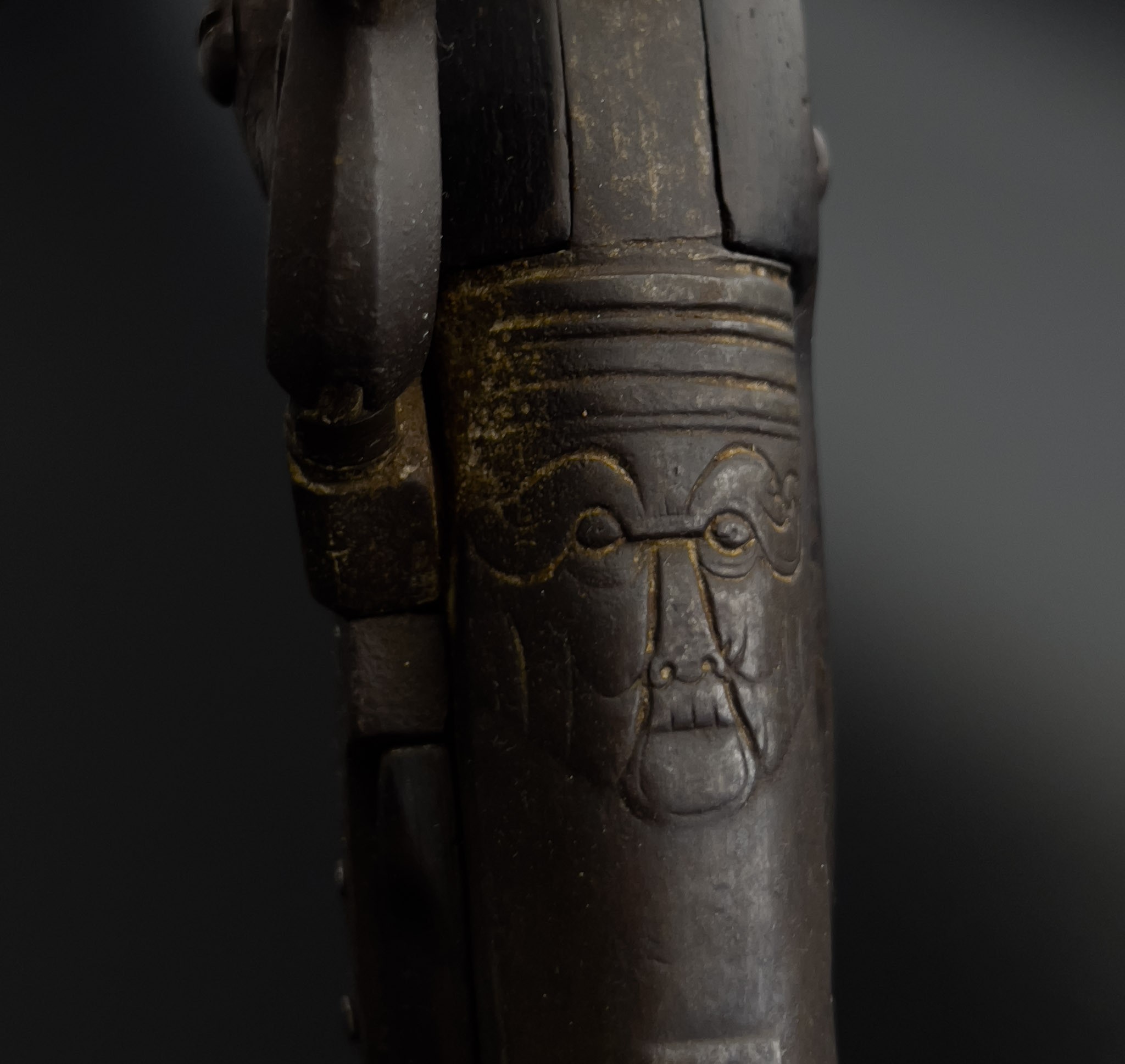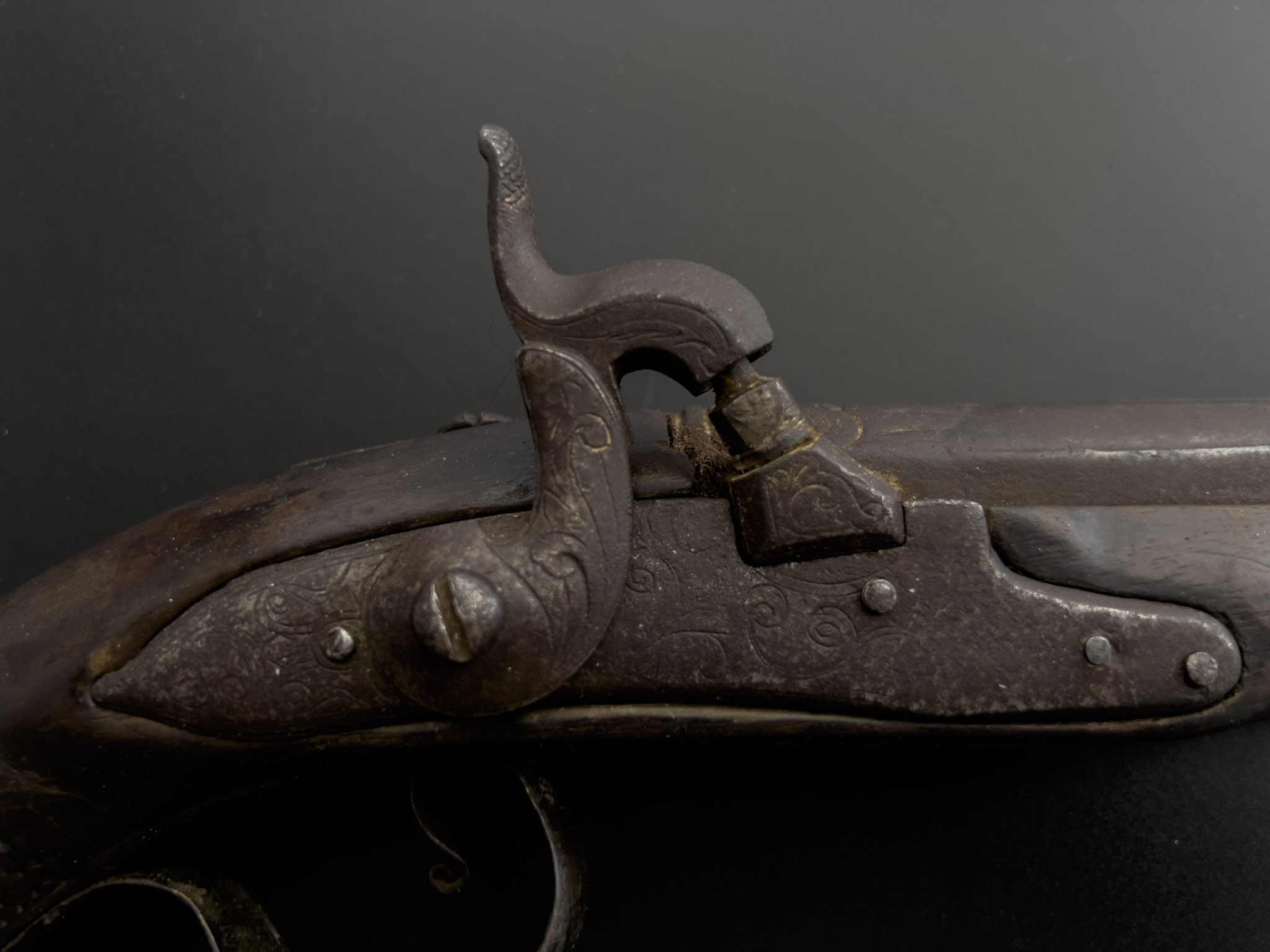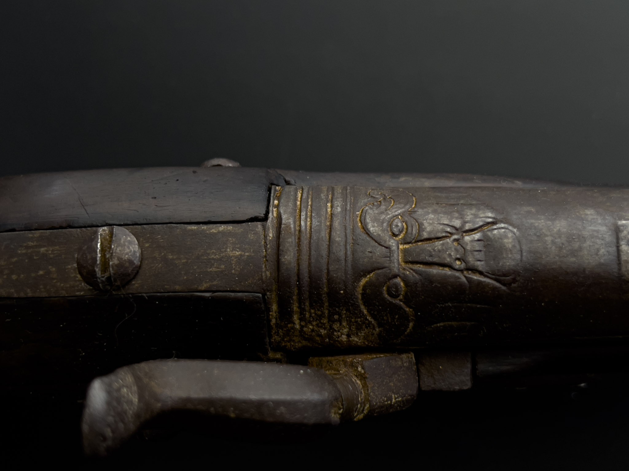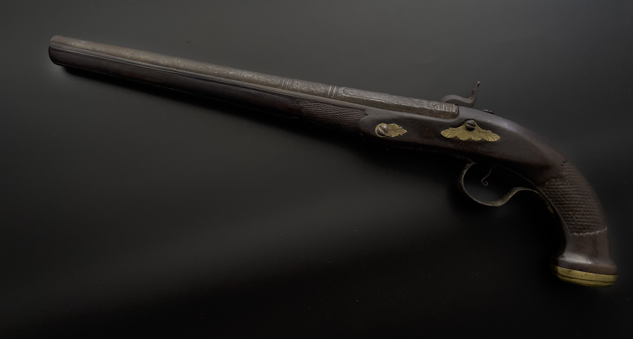Итальянский капсюльный пистолет отлично подойдет как для коллекционирования, так и декорирования. Ствол двухрядный, круглый и восьмигранный с двойным кольцом по центру. На верхней части ствола видно декоративный элемент изображения лица с остатками позолоты, так называемый «Маскарон».