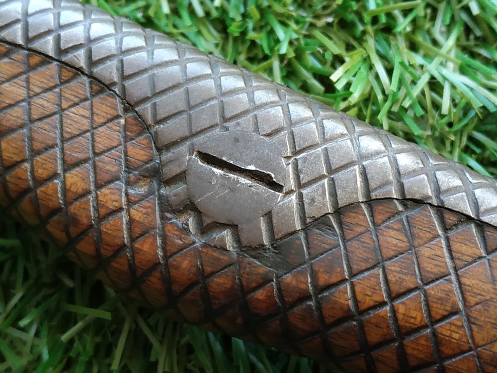 Гарнитура рукояти из гладкой вороненой стали состоит из кабуто-ганэ (набалдашник) с большим отверстием для темляка, фути (муфта у основания рукояти) и круглой цубы (гарда). Покрытая резным клетчатым узором деревянная основа рукояти либо естественного цвета, либо с черной тонировкой. Она крепится к хвостовику двумя довольно крупными болтами со шляпками на обоих концах. Выступающее в центре каждой шляпки навершие из черненой стали утоплено в деревянную основу. Зажимная скоба расположена на боковой стороне ножен.
