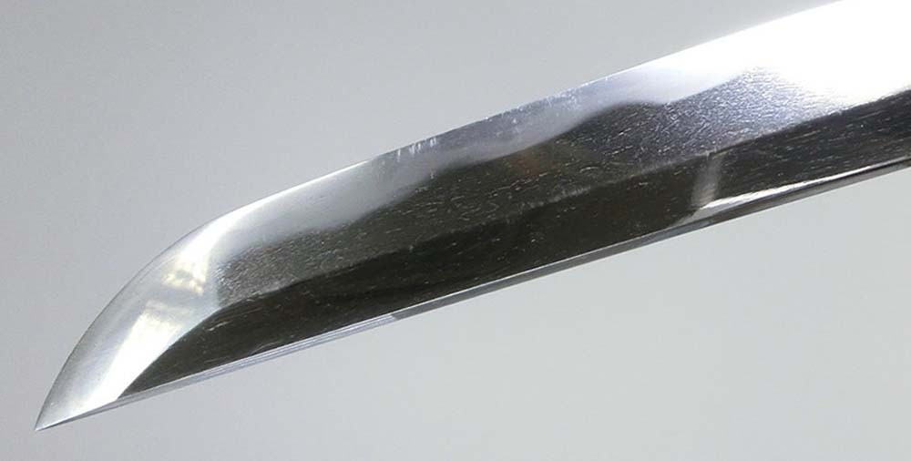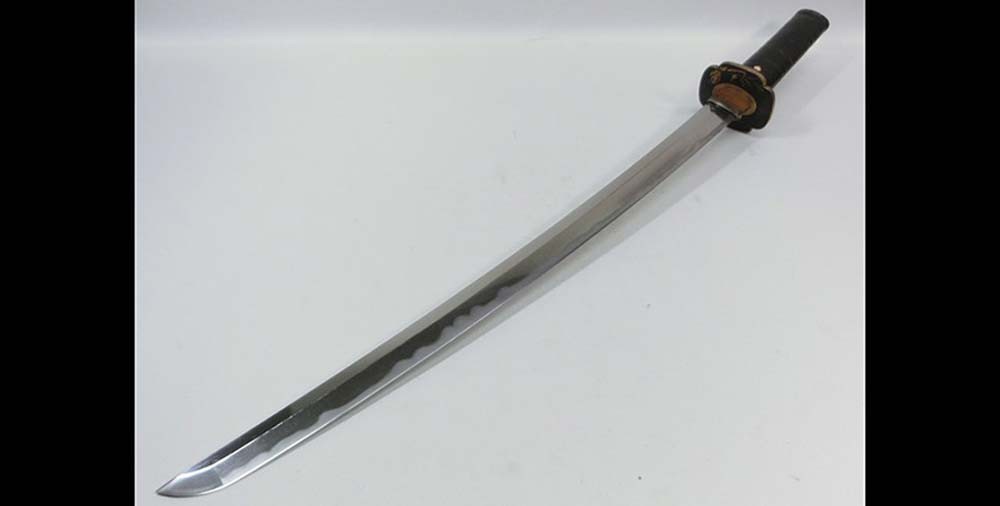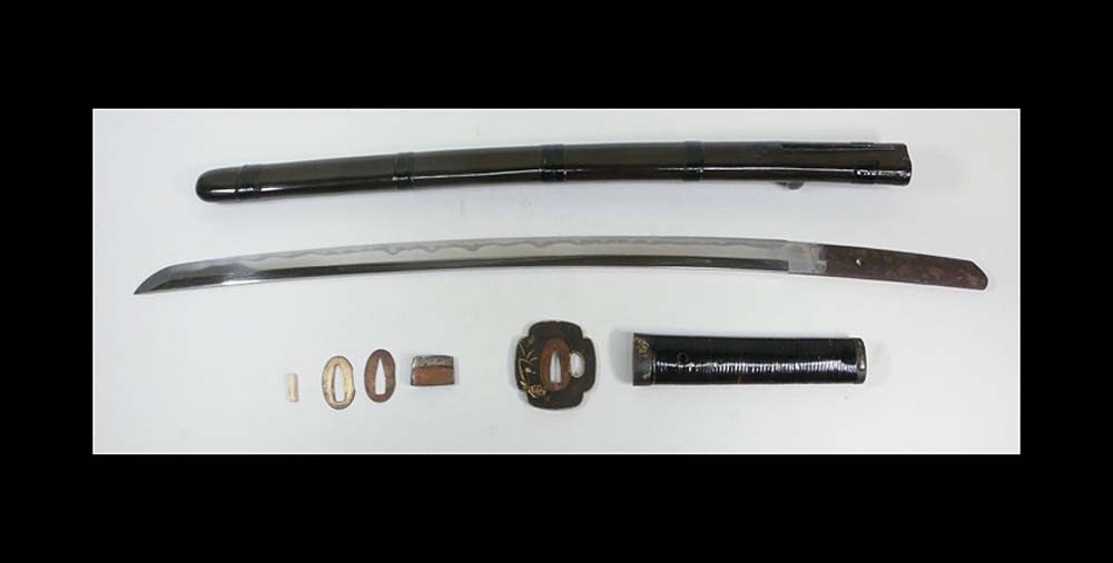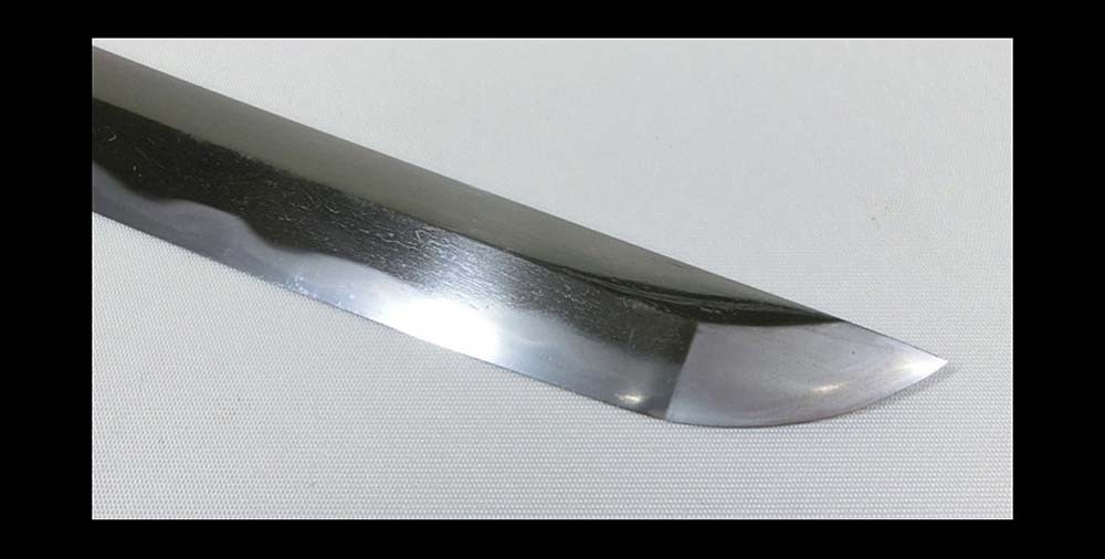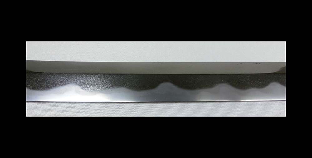 Клинок японского меча создан из японской стали (Тамахаганэ) с незначительным изгибом, четырехгранный в сечении, односторонней заточки с боевым округлым концом. Ручная ковка произведена мастрер, судя по структуре металла, в различных направлениях (итамэ-хада). Линия закалки – хамон (Гуноме). Запорная муфта – хабаки двухсоставная (вари-хабаки, предназначена исключительно для боевых мечей) пятигранной формы.