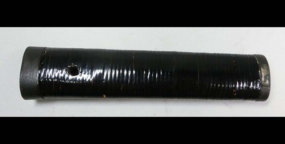 Рукоять (основа) вакидзаси деревянная черного цвета. В нижней части рукояти фиксирующая втулка – муфта фути. Деталь изготовлена также из цветного металла с позолотой. Сюжетная линия отображает сценическое изображение растительной орнаментации.