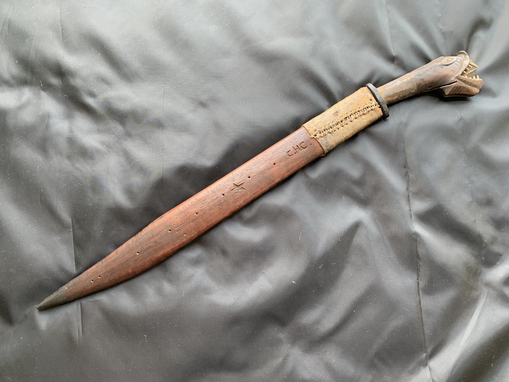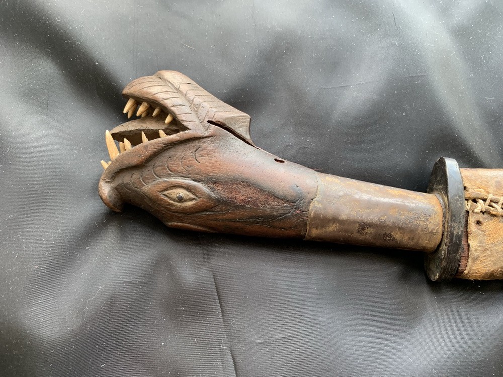 Его рукоять выполнена из дерева и украшена резьбой, она имеет небольшой изгиб и крестовидную гарду. На конце рукоять раздваивается и напоминает раскрытую пасть дракона (чаще всего встречался крокодил).