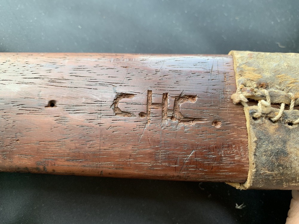 Он имеет изогнутый эфес, обычно деревянный, с раздвоенным навершием эфеса и гардой из того же материала, что и эфес, с проволочными скобами, выступающими из него с одной или обеих сторон. Как правило, он украшался пучками крашеных волос, красных или черных.