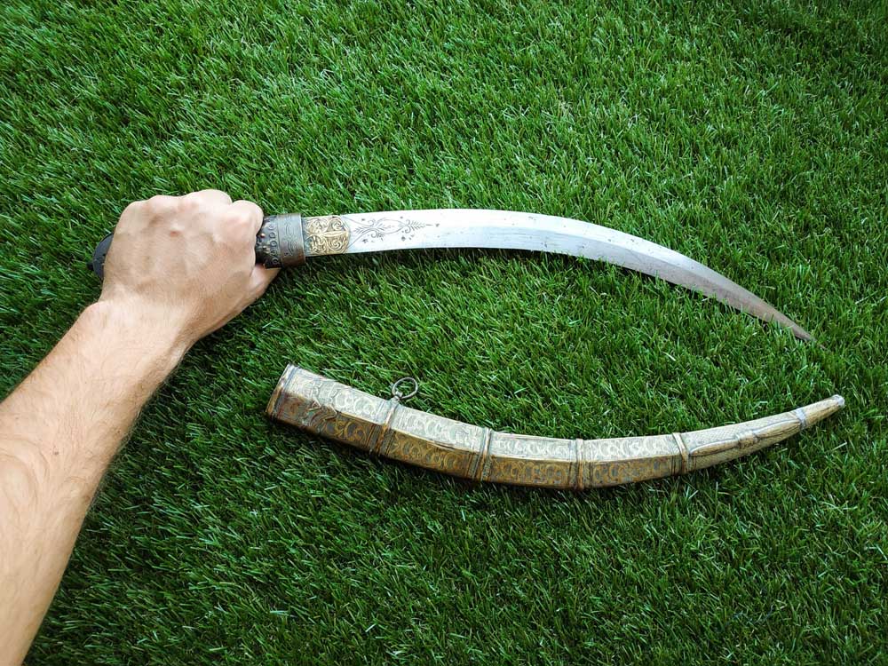 Форма эфеса очень интересная, навершие рукояти увеличенное для более удобного хвата и нижняя часть рукояти увеличенная образует гарду. Похожие эфесы изготавливает для своих кинжалов южный Ирак, возможно рукоять также происходит от кинжалов Болотных Арабов! Но, размер рукояти очень большой в сравнении с другими примерами.