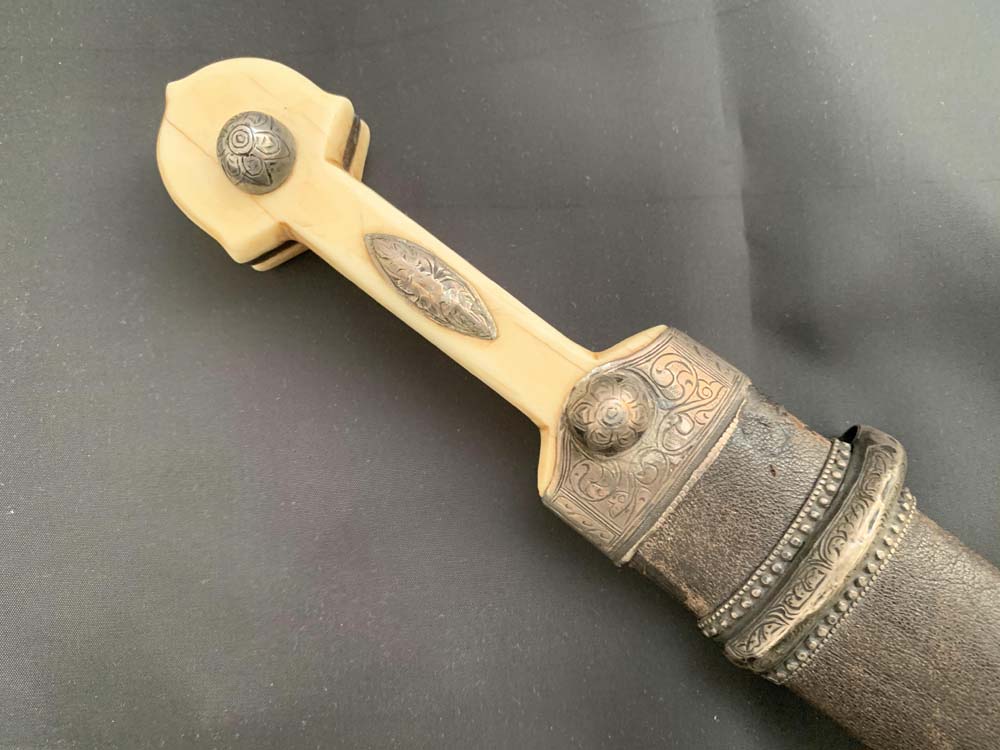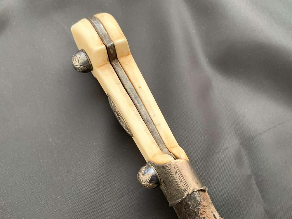 Рукоять кинжала изготовлена из двух частей, из моржовой кости желтого цвета (первоначальный цвет на период изготовления – белый). Крепеж рукояти к хвостовику осуществлен при помощи двух металлических заклепок по краям по краям и миндалевидной формы в центре. Заклепки по краям, украшенных с лицевой стороны рукояти в виде сферических шляпок. Шляпки оформлены в виде цветов. В начальной части рукояти визуально наблюдается ажурная втулка (обрамление для поддержания прямой конструкции) изготовленная из серебра и выполненная в техники гравировки на тему растительного орнамента. На центр втулки закреплен нижний заклёп.