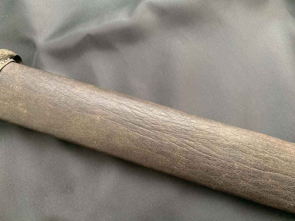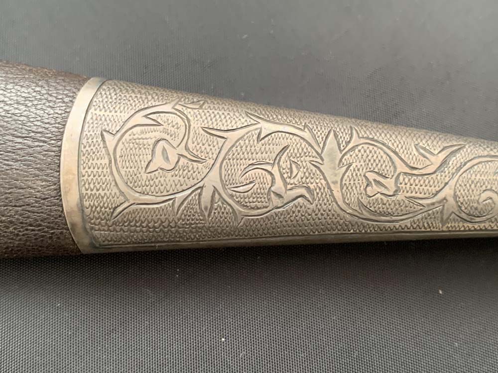 Ножны деревянные, обтянутые коричневой кожей, с серебреным прибором. Прибор ножен состоит из серебреной обоймицы, украшенной растительным орнаментом с ажурными ободками по краям, с боковой неподвижной скобой и наконечника с фигурным шариком.