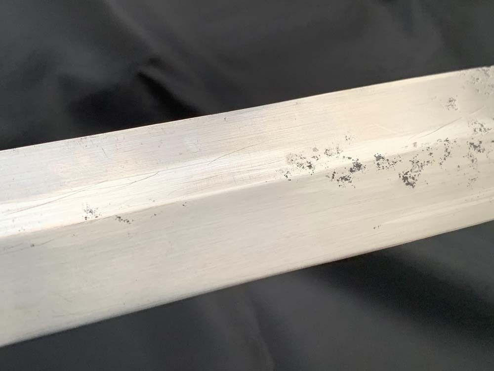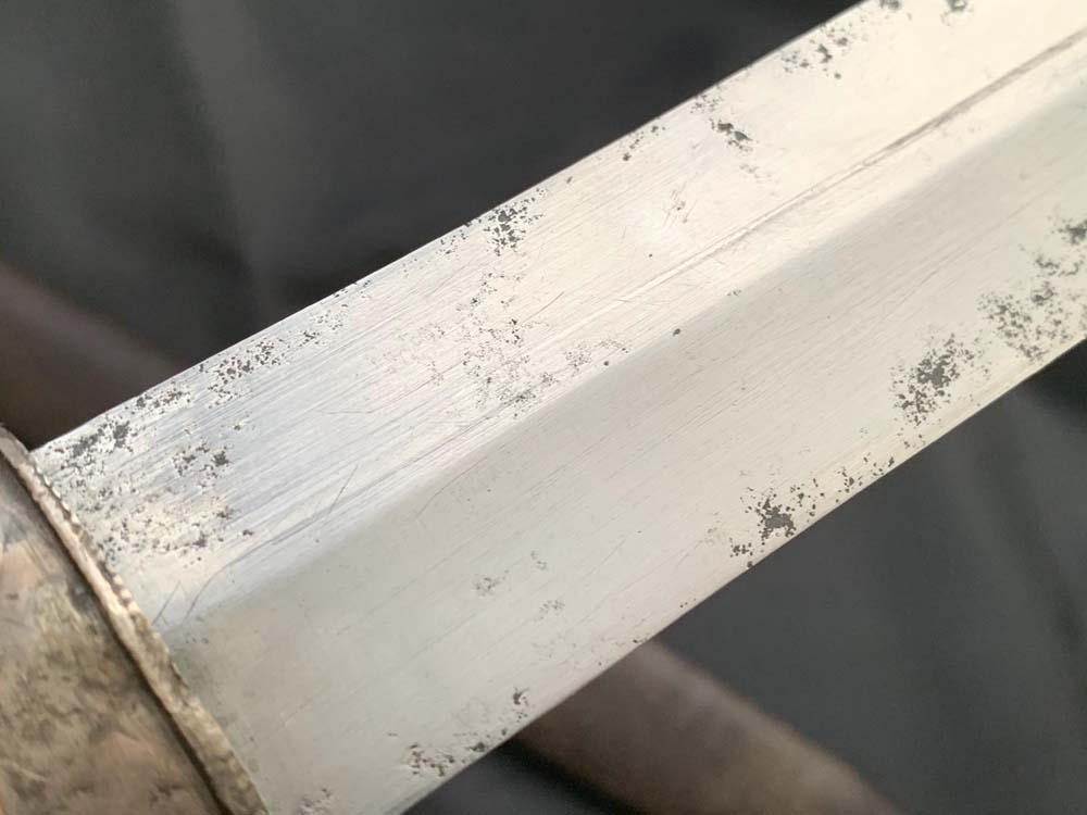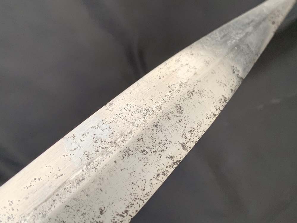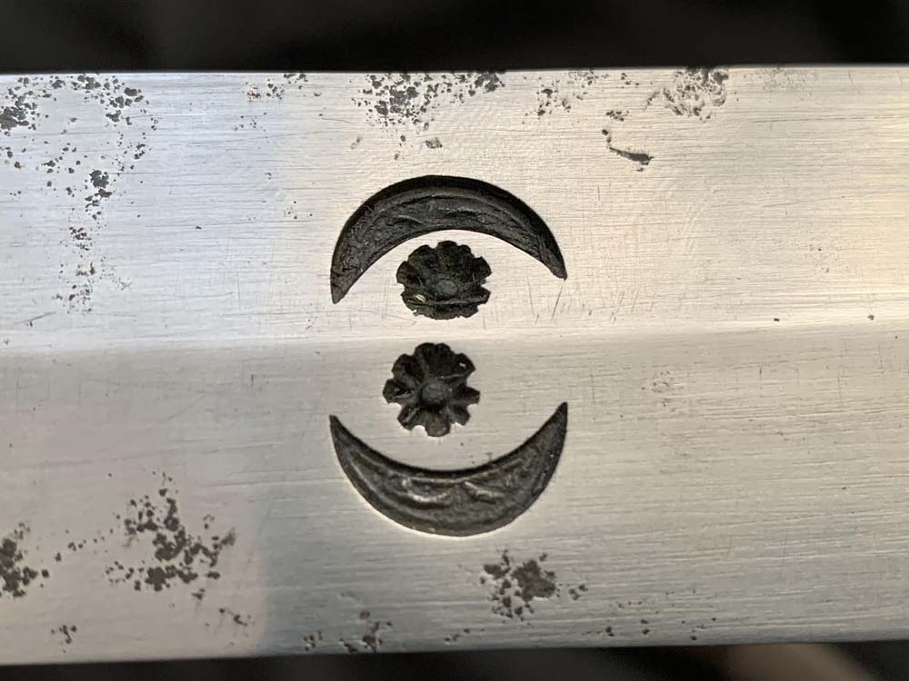 Клинок кинжала стальной, обоюдоострый, резко сужающийся к острию, без долов, ромбического сечения. На клинке ближе к рукояти есть клеймо мастера (пока клеймо не удалось идентифицировать) два полумесяца направленных друг на друга и внутри между ними два цветка.