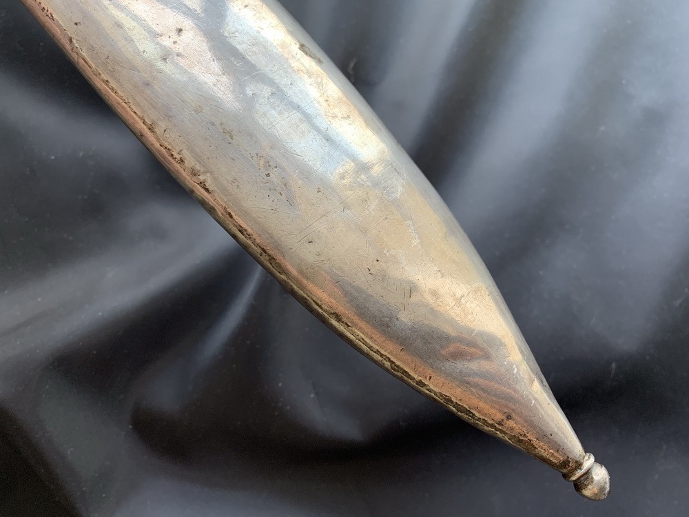 Клинок стальной, прямой, двулезвийный с двумя широким и двумя узкими доликами. Дола украшены дамаскированием. На внешней стороне клинка ближе к пяте имеется клеймо мастера изготовившего клинок (мастер Мустафа).