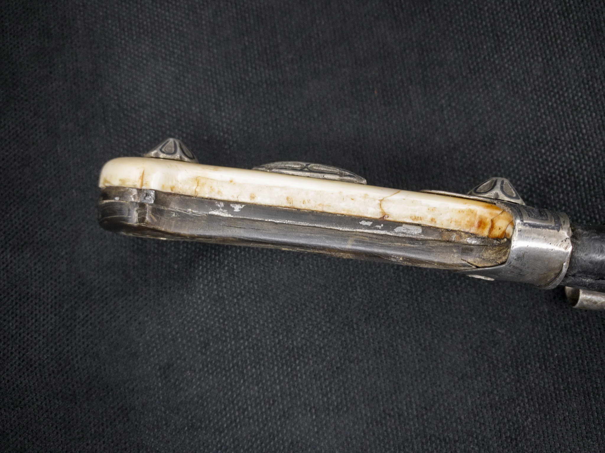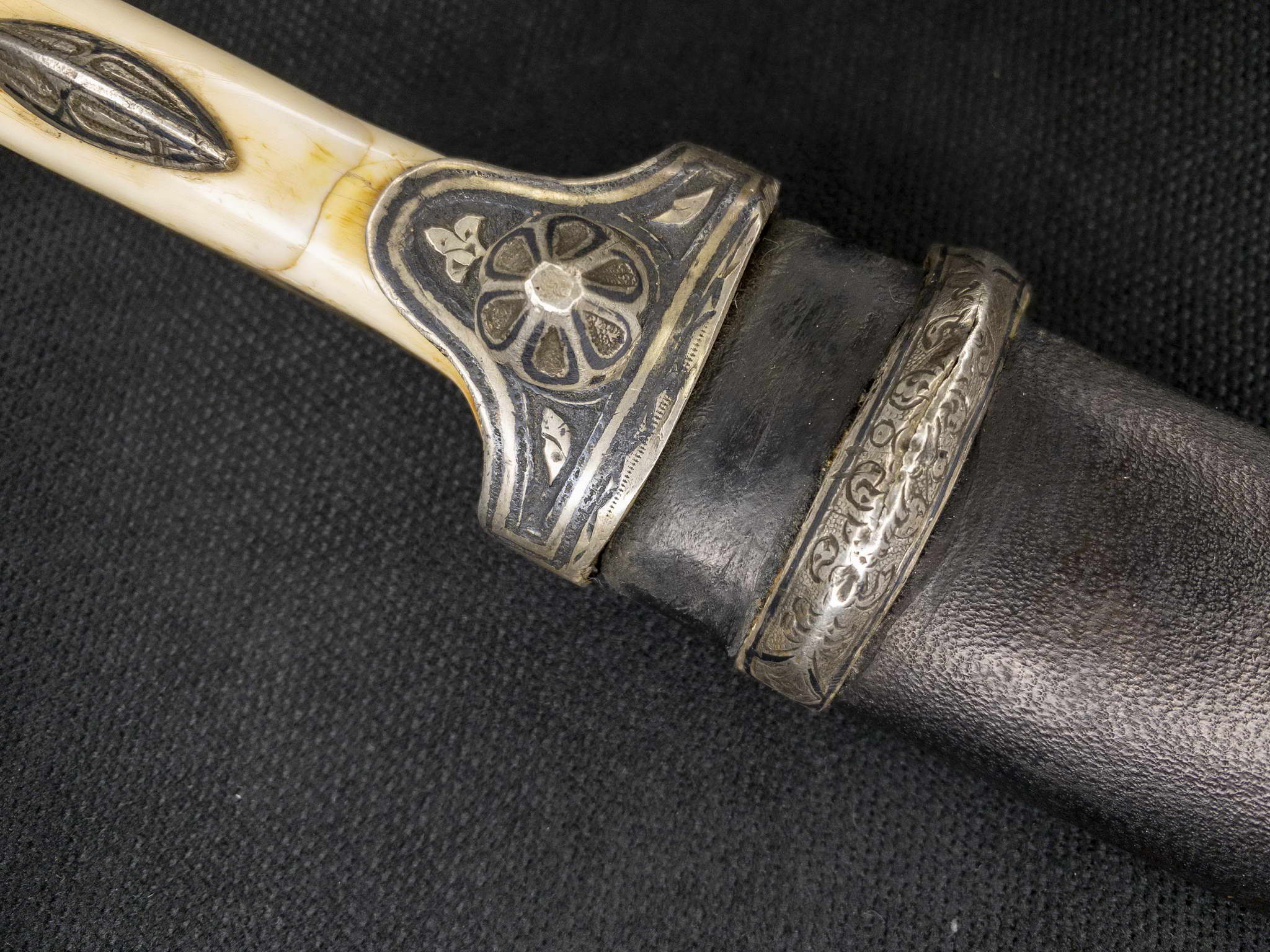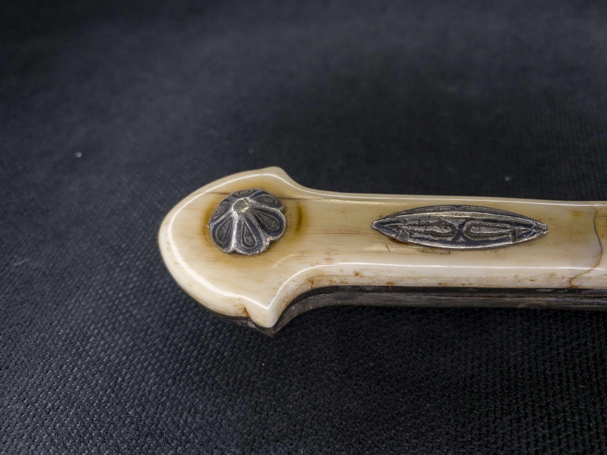 Рукоять кинжала кавказской формы и изготовлена из двух частей. Верхняя из моржовой кости желтого цвета (первоначальный цвет на период изготовления – белый) и нижняя из рога. Крепеж рукояти к хвостовику осуществлен при помощи двух металлических заклепок по краям по краям и миндалевидной формы в центре. Заклепки по краям, украшенных с лицевой стороны рукояти в виде сферических шляпок. Шляпки оформлены в виде цветов. В начальной части рукояти визуально наблюдается ажурная втулка (обрамление для поддержания прямой конструкции) изготовленная из серебра и выполненная в техники гравировки на тему растительного орнамента. На центр втулки закреплен нижний заклёп.