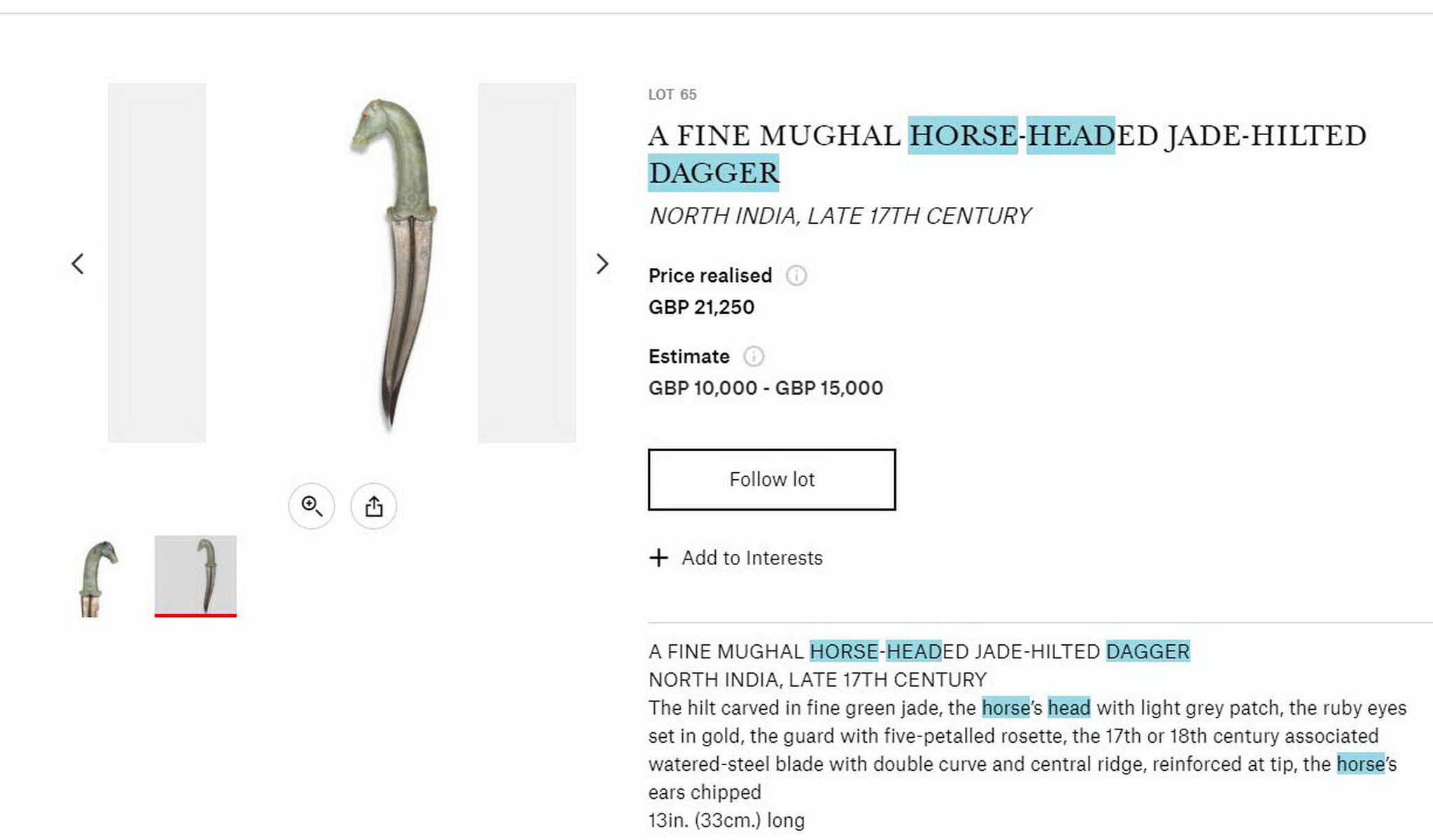 Кинжал с конской головой впервые изображен на картинах «Падшханама» («Хроника царя мира»), около 1635 года, рукопись, в которой документировано правление императора Великих Моголов Шах Джахана (ок. 1628–58). Поскольку лошади высоко ценились в культуре Моголов, неудивительно, что кинжалы в виде головы лошади были самым популярным предметом для зооморфных рукояти в течение нескольких столетий. Пример с сайта отличается деликатным вырезанием головы и ушек лошади.