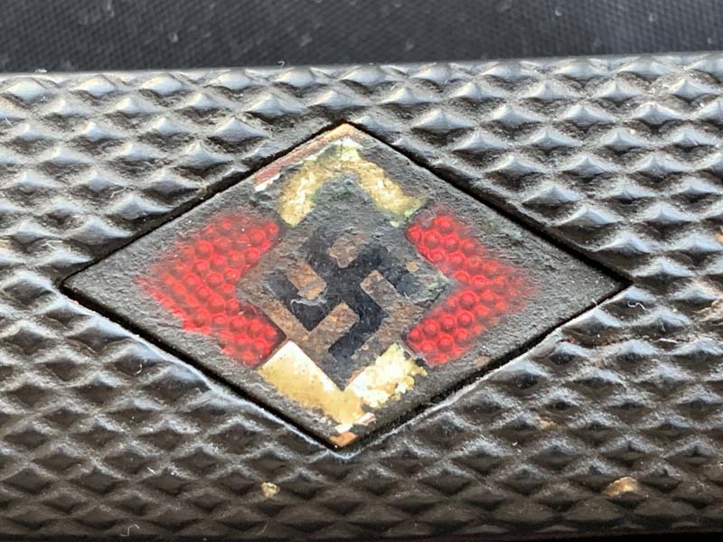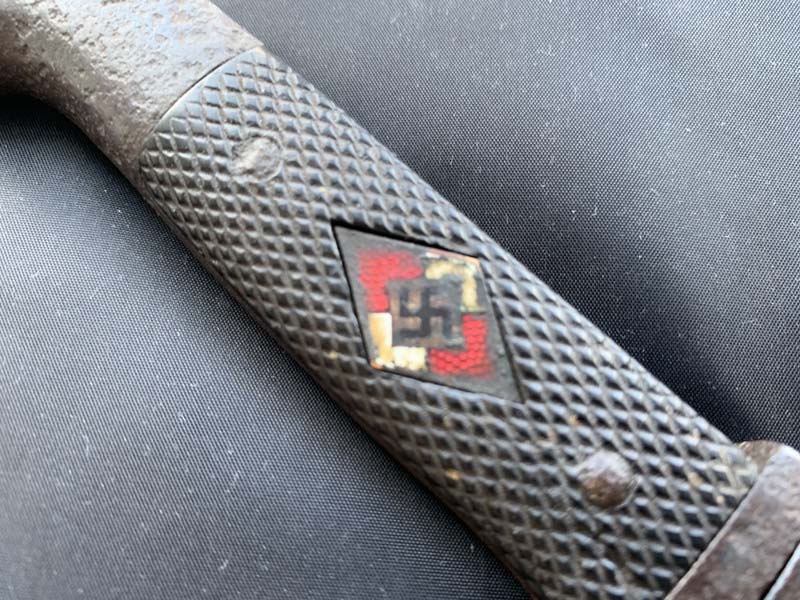 Рукоять изготовлена из никелированного сплава и из двух рифленых пластмассовых накладок, соединенных двумя заклепками. На лицевой стороне рукояти расположен символ Гитлерюгенда в виде ромба красного, черного и белого цветов.