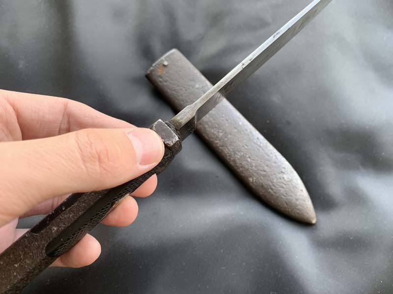 Гладкие ножны изготовлены из металла и были окрашены в черный цвет. На ножнах был утрачен кожаный ремешок. Внешнее оформление ножа спроектировано с целью уменьшения его стоимости.
