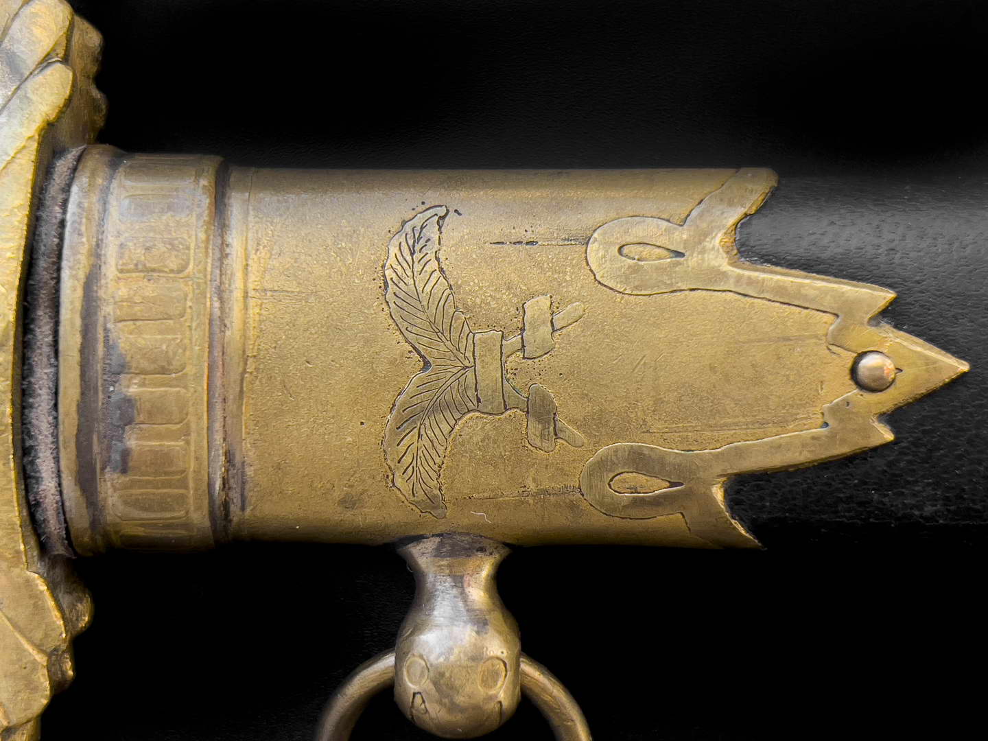 Ножны деревянные, обтянутые черной кожей. Устье ножен с лицевой стороны украшено травленым изображением Герба СССР, а с обратной – двумя скрещенными пальмовыми ветвями. Гайка и наконечник украшены травяным растительным и геометрическим орнаментом. Прибор ножен латунный, позолоченный.