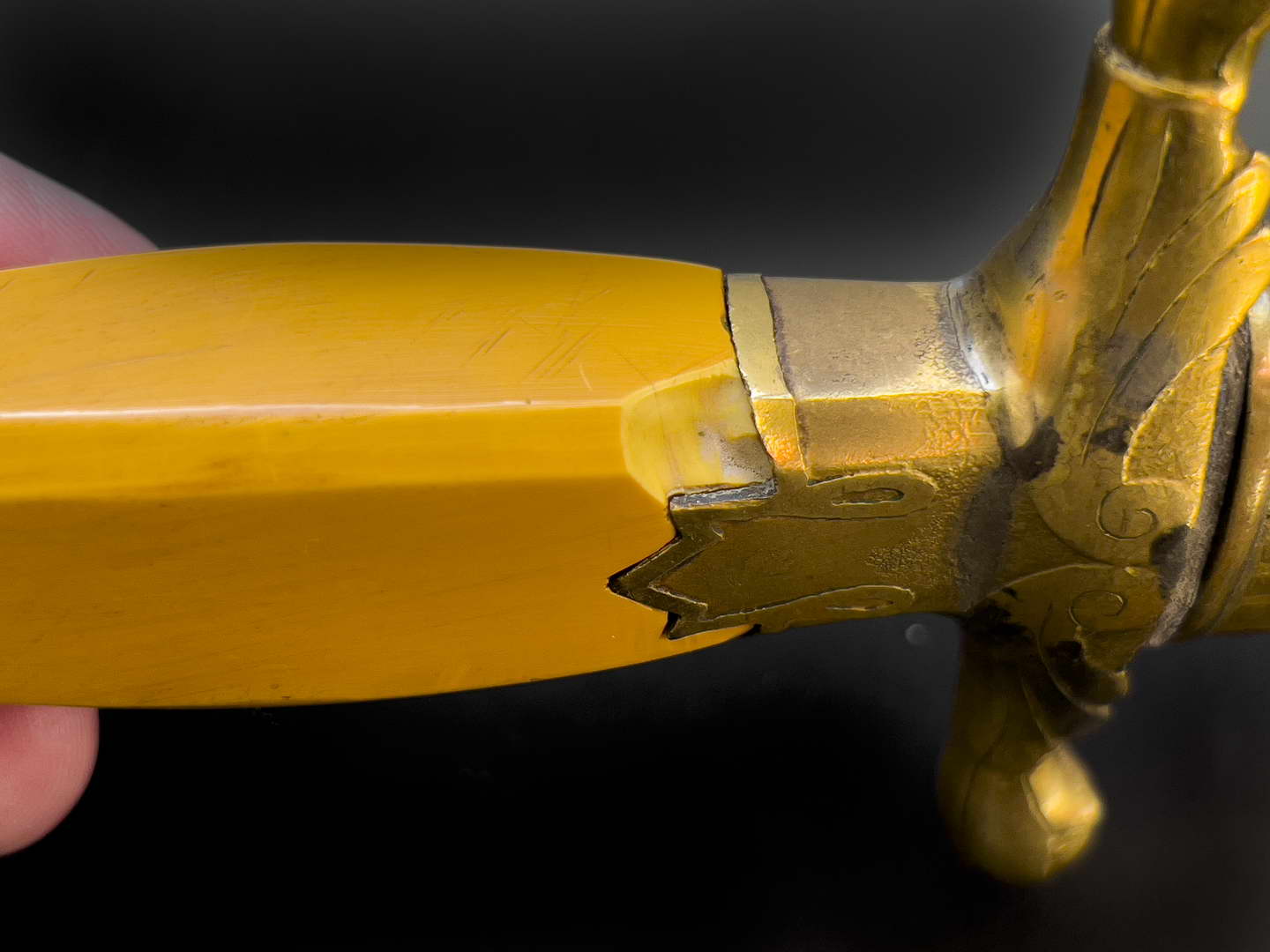 Руки из желтой пластмассы, с фигурными золочеными втулками, украшенными травленым орнаментом. На рукоятке есть незначительные сколы с внутренней стороны. На вершине – нанесенное штампом изображение серпа и молота. Позолота на металлических частях в значительной степени сохранилась, немного потерта при бытовании предмета.