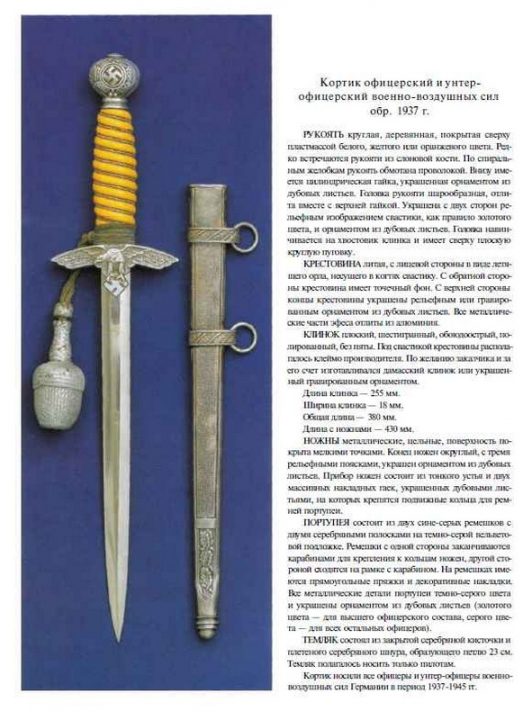 Кортики Люфтваффе образца 1937 года стали неотъемлемой частью униформы офицеров и унтер-офицеров немецких военно-воздушных сил во время Второй мировой войны. Они заменили предыдущие образцы кортиков, представляя более изящный и официальный вариант парадного оружия.