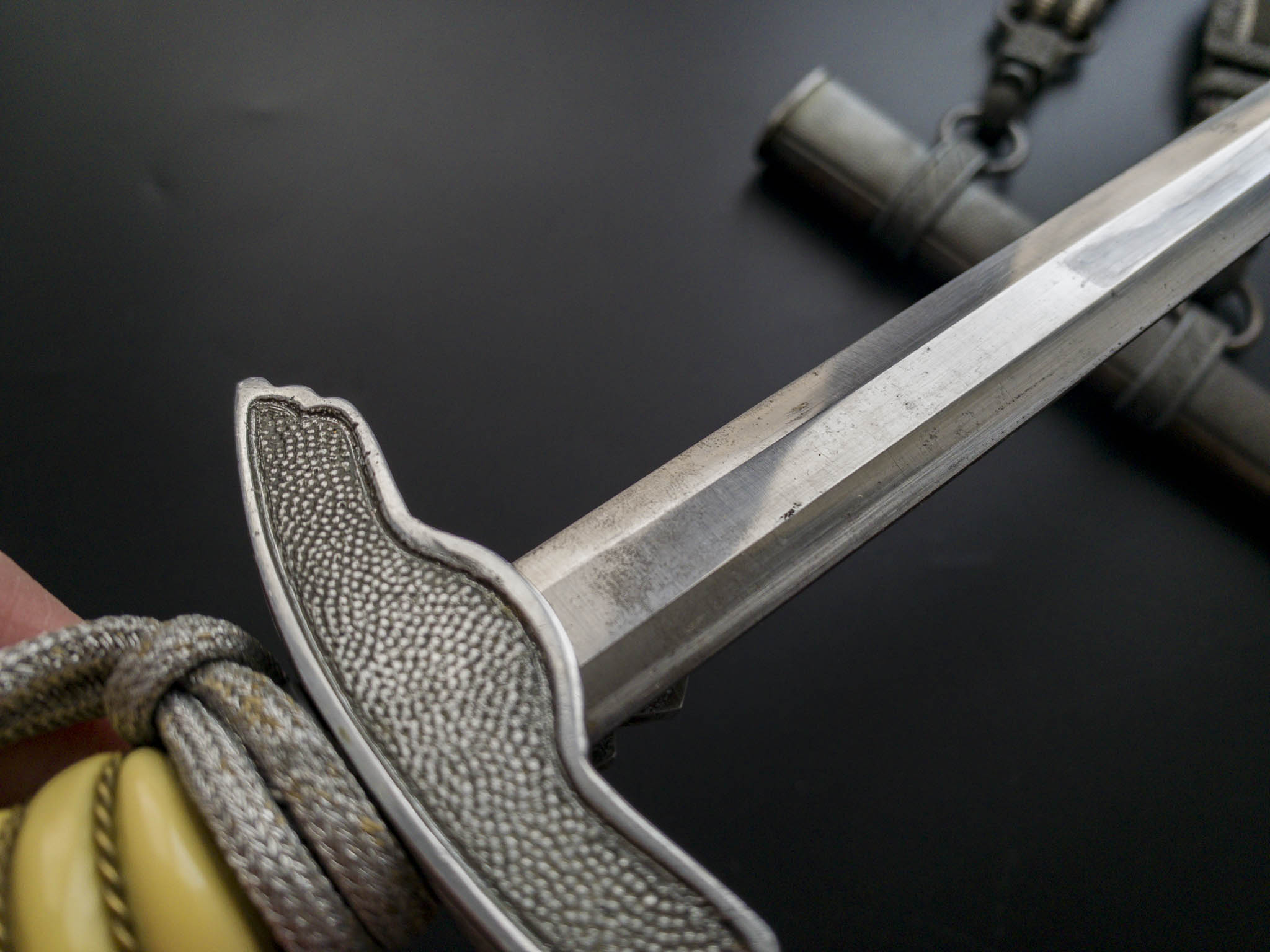 Рукоять круглая, пластмассовая, цвета слоновой кости. По спиральным желобкам рукоять обмотана проволокой. Внизу имеется цилиндрическая втулка из мельхиора, украшенная орнаментом из дубовых листьев. Головка рукояти шарообразная, отлита вместе с верхней гайкой. Украшена с двух сторон рельефным изображением свастики и орнаментом из дубовых листьев. Головка навинчивается на хвостовик клинка и имеет сверху плоскую круглую пуговку. Крестовина литая, с лицевой стороны в виде летящего орла, несущего в когтях свастику. С обратной стороны крестовина имеет точечный фон. Головка и крестовина изготовлены из цинка.