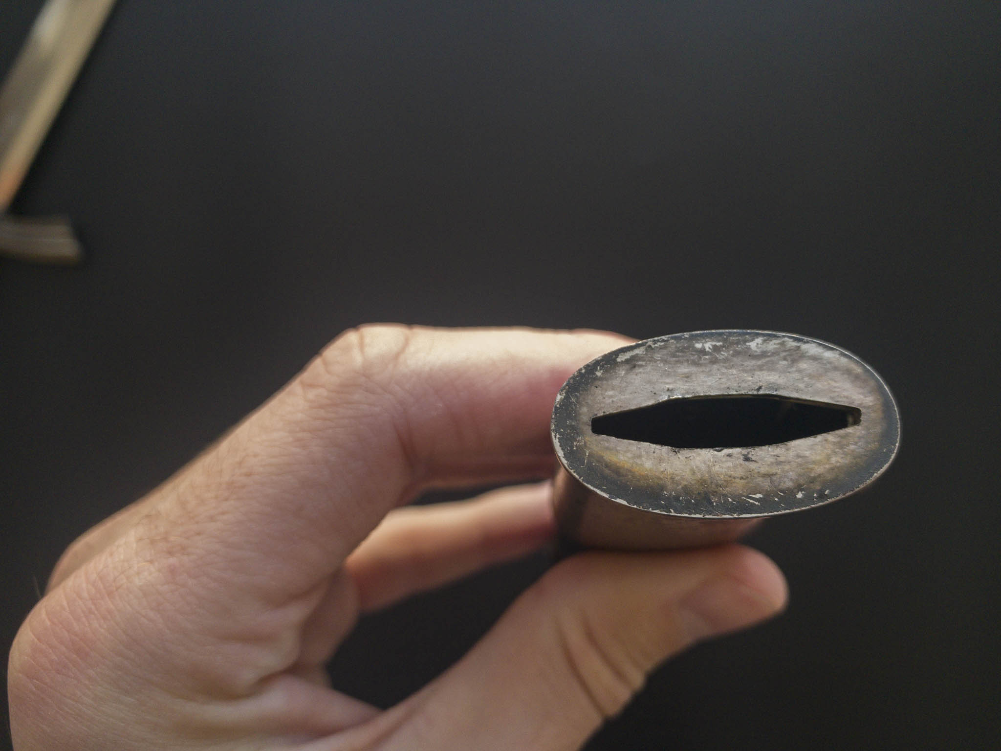 Описание: Клинок плоский, обоюдоострый, в основной части шестигранного сечения, у острия переходит в ромбовидную форму. Поле клинка имеет оригинальное никелированное покрытие, в нижней части вытравлено клеймо производителя логотип в виде весов и надпись «ALCOSO Solingen».