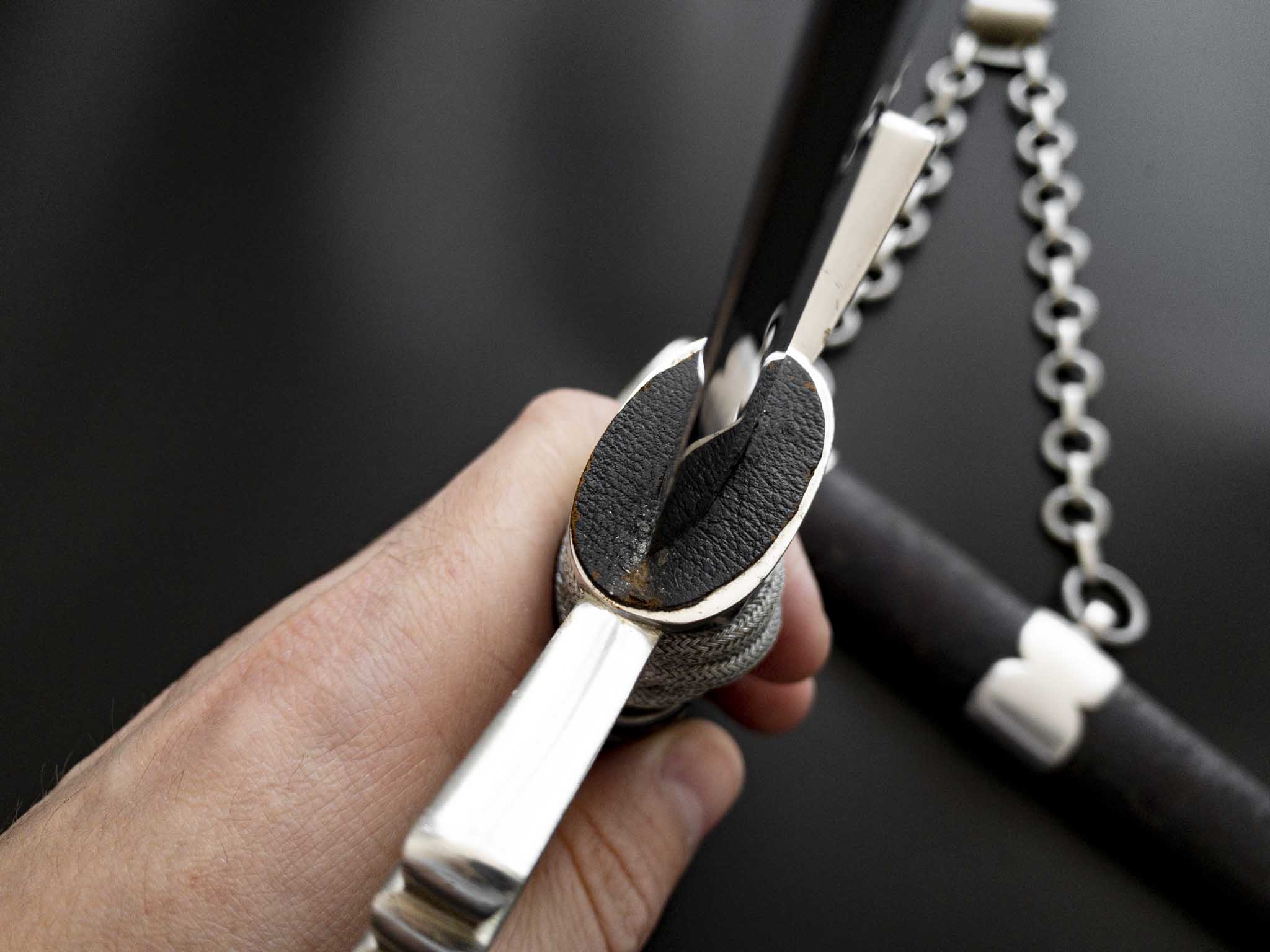 Подвес из четырнадцати алюминиевых колец и фиксирующего карабина. Темляк оригинальный серебристо серого цвета соответствует стандартной длине.