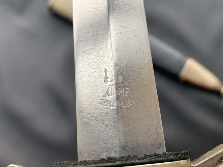 Клинок кортика стальной, четырехгранный, с плавным скосом на оконечную заостренную листовидную часть, обоюдоострый, (пере полированный). На тыльной стороне клинка, клеймо, выполненное методом травления и состоящее из стилизованного изображения сидящего правителя с мечом в руке и увенчанного царственной короной. Под изображением надпись на немецком языке SMF. SOLINGEN (на нем. Stocker Metallwaffennfabrik Solingen; на рус. Штеккер Завод металлического оружия, Золинген). Клинок такой конфигурации предполагал как колющие, так и режущие действия.