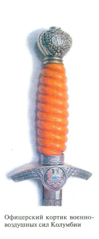 Исторические сведения: После Второй мировой войны в некоторых странах за океаном ввели кортики для офицеров военно-воздушных сил, которые отличались отделкой, иногда очень богатой. Интерес в этом отношении представляет, например, офицерский кортик военно-воздушных сил Колумбии. Его рукоятка напоминает таковую у германского кортика «модель 1938».Клинок двулезвийный, в поперечном разрезе — сплюснутый шестиугольник. Плечи гарда опущены вниз на манер крыльев. В центре гарда — круглый щит с гербом Колумбии в серебристо-голубых и красных цветах. Хватка веретенообразная, из материала оранжевого цвета, рифленая, в виде спиральных колец. Внизу черенка — обруч, покрытый орнаментом из дубовых листьев. Наконечник в виде шара, на нем тоже орнамент из дубовых листьев. Кожух ножен из черной кожи, на них две металлические оковки. На верхней оковке зацепка для лапки, нижняя заканчивается сплющенным шаром.