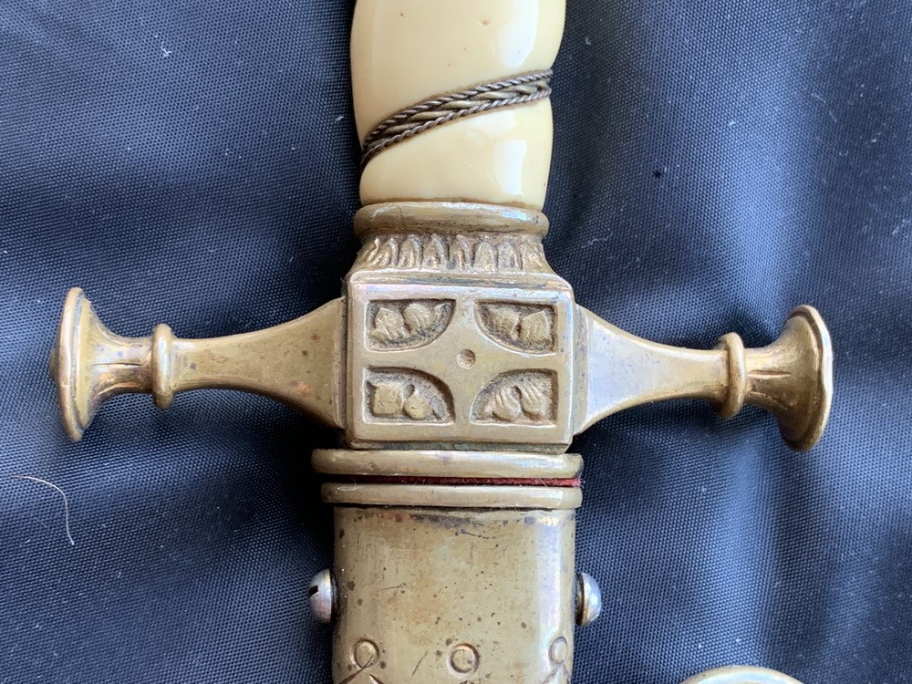 ножны латунные позолоченные (могли быть позолоченными или никелированными), украшены геометрическим орнаментом. На ножнах имеются две рельефные гайки с подвижными кольцами для ремней портупеи. Между гайками находится рельефное изображение государственного герба Королевства Югославия.