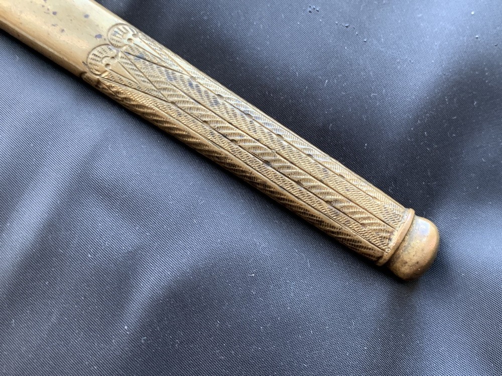 Рукоять пластмассовая, цвета слоновой кости (могла быть пластмассовая, черного цвета, деревянная, покрытая пластиком, либо алюминиевая), со спиральными желобками, по которым обвита крученой проволокой. Головка рукояти выполнена в виде стилизованного морского узла (встречались варианты с головкой рукояти в виде короны или шара, украшенного узором из волн).