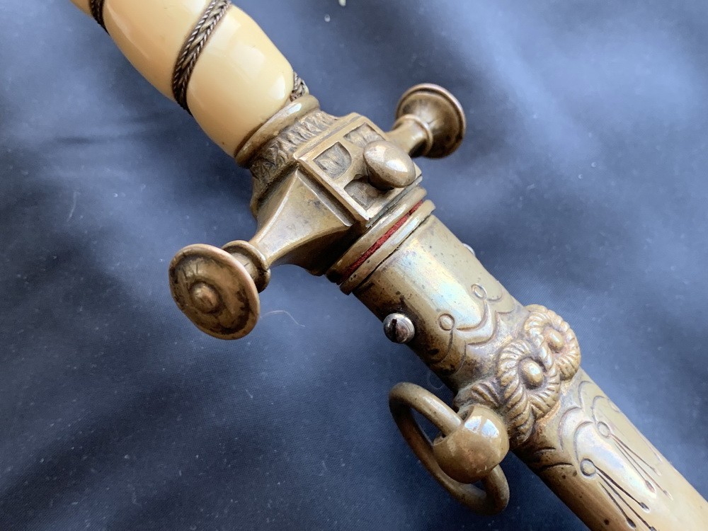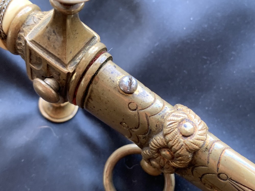 На данном кортике отсутствует, но судя по историческим справкам портупея использовалась в двух вариантах: из двух кожаных ремней коричневого цвета с овальными пряжками и позолоченным прибором портупеи или кожаных ремней черного цвета с никелированным прибором портупеи.
