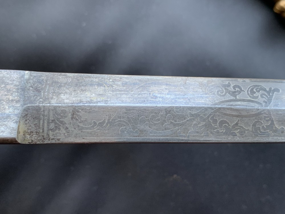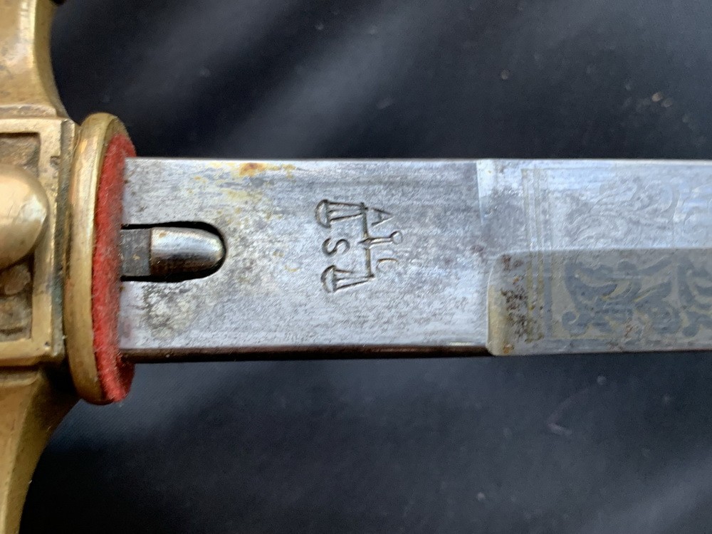 Клинок прямой, двулезвийный, ромбического сечения, без долов, никелированный, украшен травленым растительным орнаментом. Пята усилена, расположено клеймо фирмы ALCOSO.