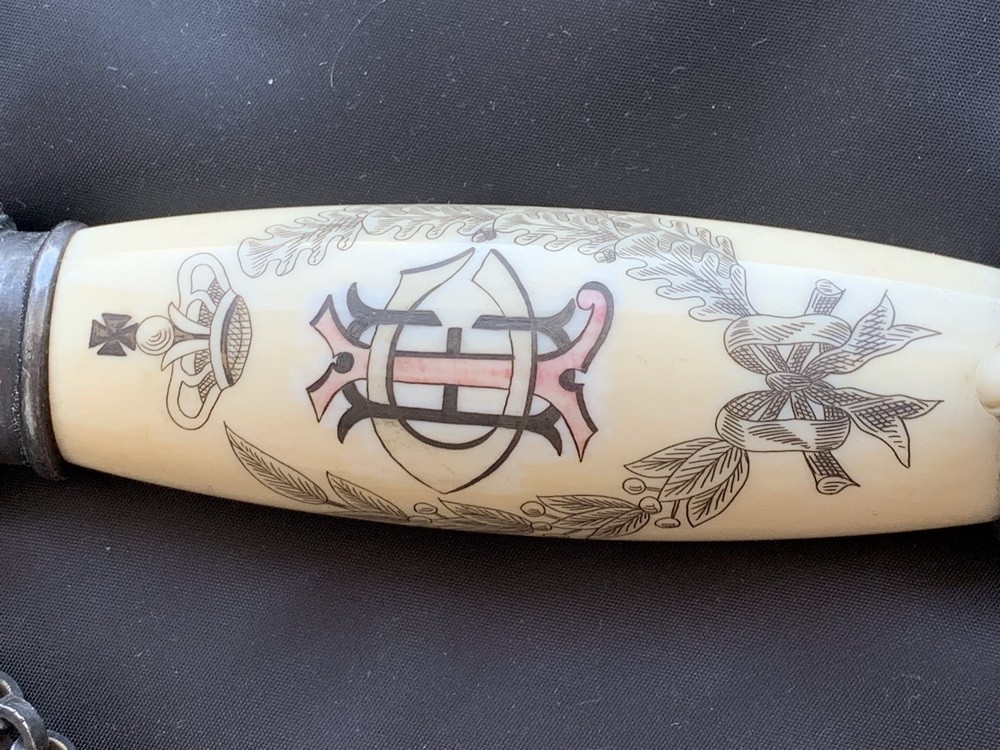 Эфес состоит из белой пластмассовой рукояти и латунной гарды. Веретенообразная рукоять с металлической головкой в виде рыцарского шлема с опущенным забралом, которая соединена с крестовиной цепью. Перекрестие в виде ажурной прорезной конфигурации с окончаниями в виде тамплиерских крестов, в средней части детали овальный медальон с центральным изображением монаха (владелец решил увековечить свое лицо на мече). С обратной стороны на крестовине в центре изображен крест. На лицевой (правой) стороне рукояти выгравирована владельческая монограмма CEL (Chas E. Legate)в дубовом веночном обрамлении, корона над ней с крестом. На левой стороне выгравирован крест, вложенный в треугольник, на фоне расходящихся лучей.