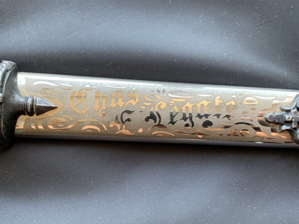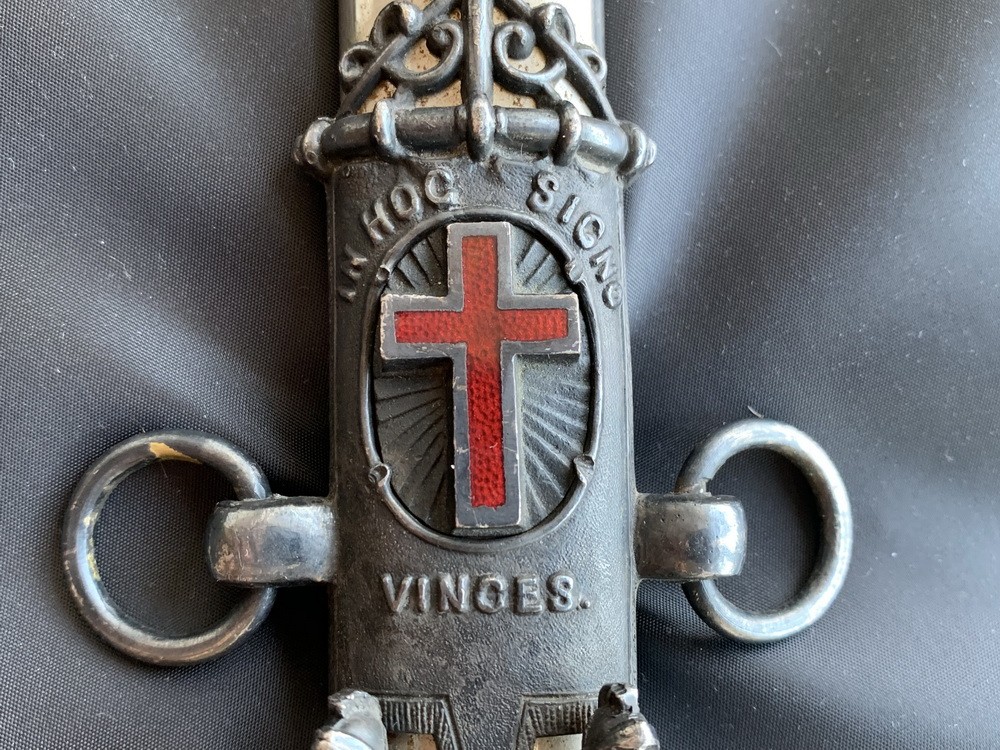 Ножны металлические. Прибор ножен литой, латунный, состоит из узкого устья, двух удлинённых фигурных обоймиц с кольцами для подвеса (верхняя имеет два кольца, нижняя – один) и фигурного наконечника с башмаком. Все детали прибора закреплены одиночными винтами на обратной стороне футляра ножен. Поверхность деталей прибора покрыта сложным литым орнаментом, воспроизводящим символику Ордена Тамплиеров. На устье с лицевой стороны изображены латинский крест и два рельефных литых рыцаря под ним. По окружности надпись на латыни IN HOC SIGNO VINCES (ПОД ЭТИМ ЗНАМЕНИЕМ ТЫ ПОБЕДИШЬ; римское выражение, связанное с римским императором Константином I Великим, 306-337 гг.) обозначающая девиз масонского тамплиерского Ордена. Обоймица несёт вензельную монограмму К и Т (Knights Templar – рыцари Храма). На ножнах с лицевой стороны нанесена надпись «Chas E. Legate». Наконечник симметричный листовидный украшенный.