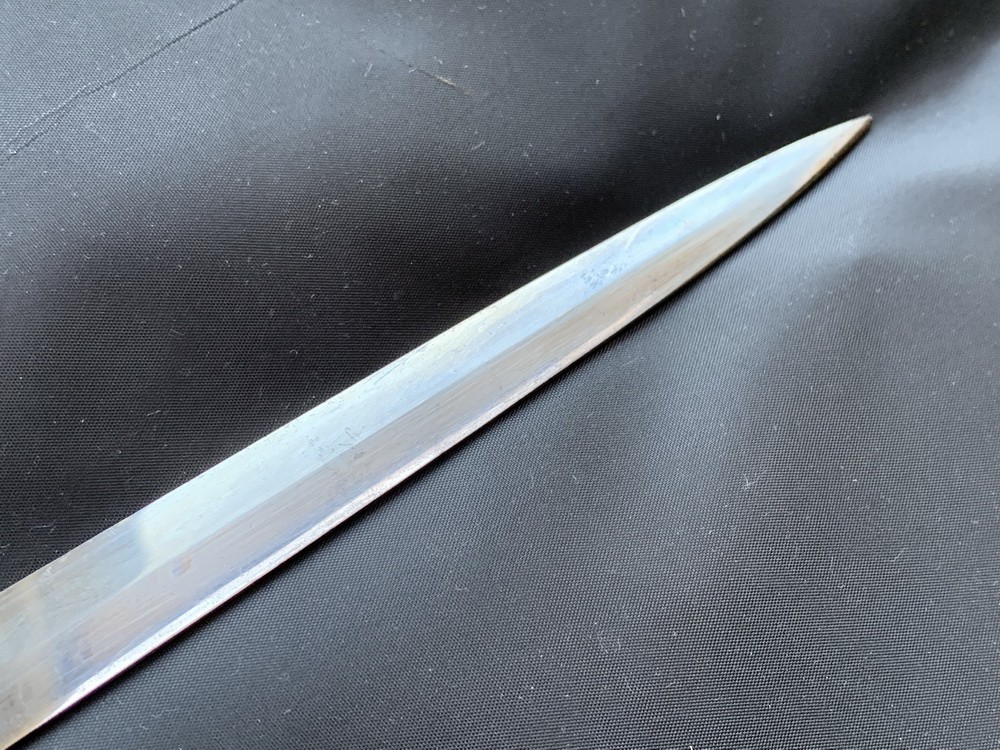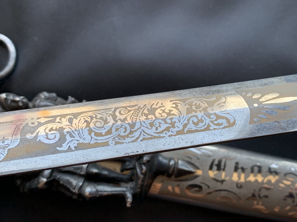 Клинок шпаги стальной никелированный, прямой, в сечении ромбический, с выраженной пятой. На клинок насажена кожаная прокладка, плотно прилегающая к крестовине. По обеим сторонам клинка вытравлены изображения символико-нарративного характера, а также подписи (с имитацией золочения фона): — на одной стороне – сцена рыцарского поединка на фоне иерусалимского Храма Гроба Господня под высоким куполом (он же образ символического Града на холме) в окружении пальм и шатров; фигуры пешего и конного рыцарей — крестоносцев; штандарты и доспехи с крестами; клеймо производителя в картуше на пяте Ames Sword Chicopee, Massachusetts — на другой стороне – рыцарь — крестоносец и доспехи с оружием; вытравленное готическими литерами имя владельца меча Chas E. Legate («Час Е. Легат ») в орнаментированном картуше. Ames Sword Chicopee, Massachusetts производитель, действующий 1848-1898 годы.
