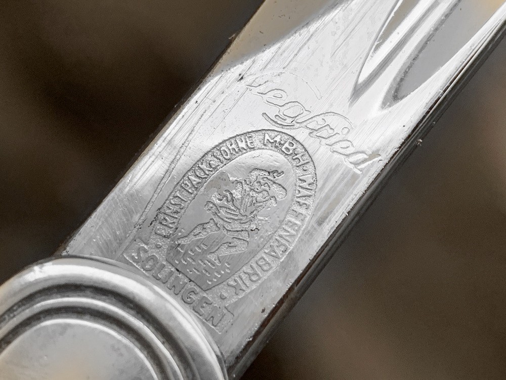 Клинок сабли стальной, кованый, никелированный, незначительной кривизны, однолезвийный боевой конец двулезвийный. С обратной стороны на пяте клинка визуально наблюдается производственное клеймо Siegfried Ernst Pack & Söhne (E. P. & S.) Solingen, клеймо в виде молотобойца.