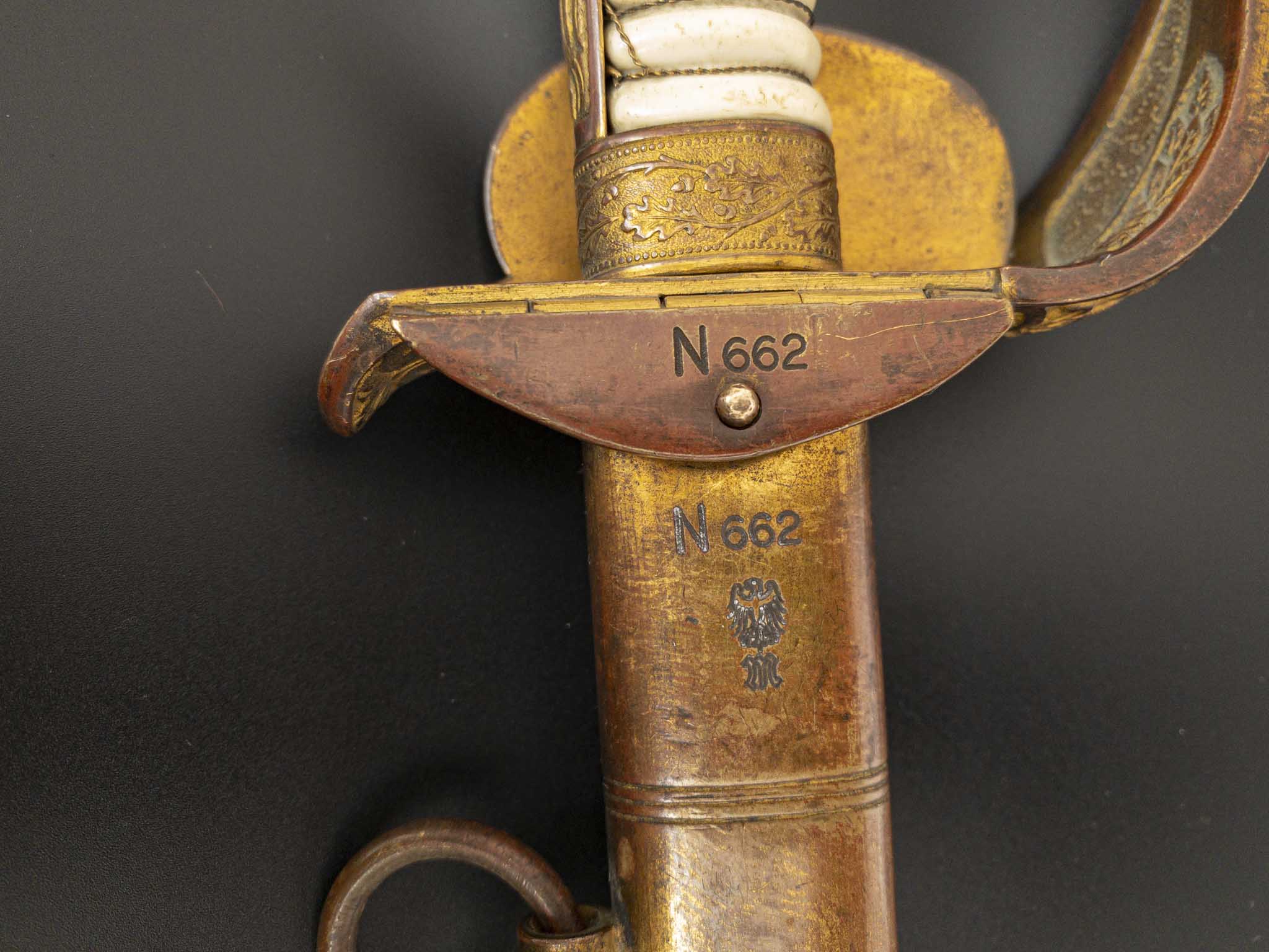 Ножны сабли металлические (не магнититься) обтянуты черной кожей состоят из латунного прибора украшенного гравировкой: устья и обоймицы с кольцами для портупеи, а также наконечника. На внутренней стороне устья шпенёк, на который откидывается малый щитик гарды (на нём имеется соответствующее отверстие). На ножнах также присутствует клеймо «N662» и изображение орла с опущенными крыльями — герб Веймарской республики (N обозначает морскую базу Нордсее)